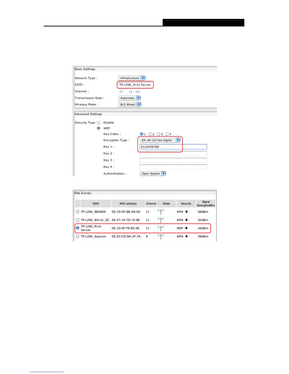 TP-LINK_Print Server, and the security type is WEP-64bit Hex Open, with the password set