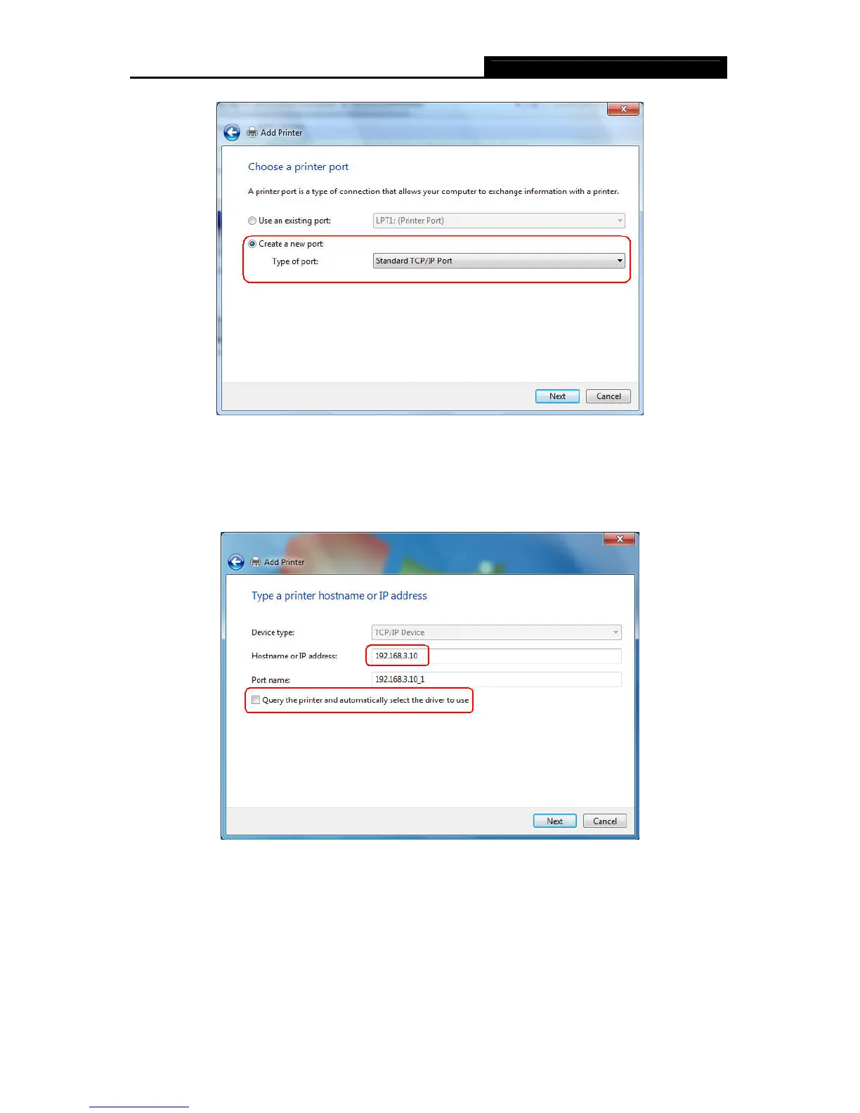 5. Input the IP address of the print server and click Next. The windows will detect the TCP/IP