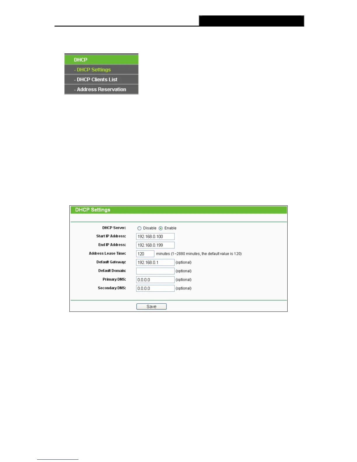 There are three submenus under the DHCP menu (shown in Figure 4-25): DHCP Settings, DHCP