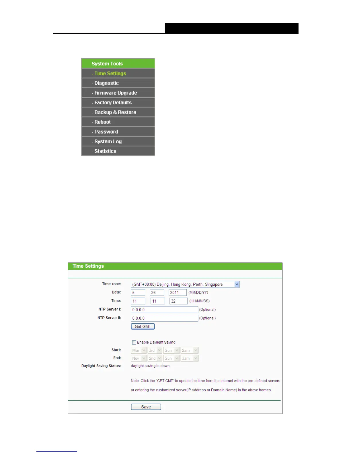 Choose menu “System Tools→Time Setting”, and then you can configure the time on the
