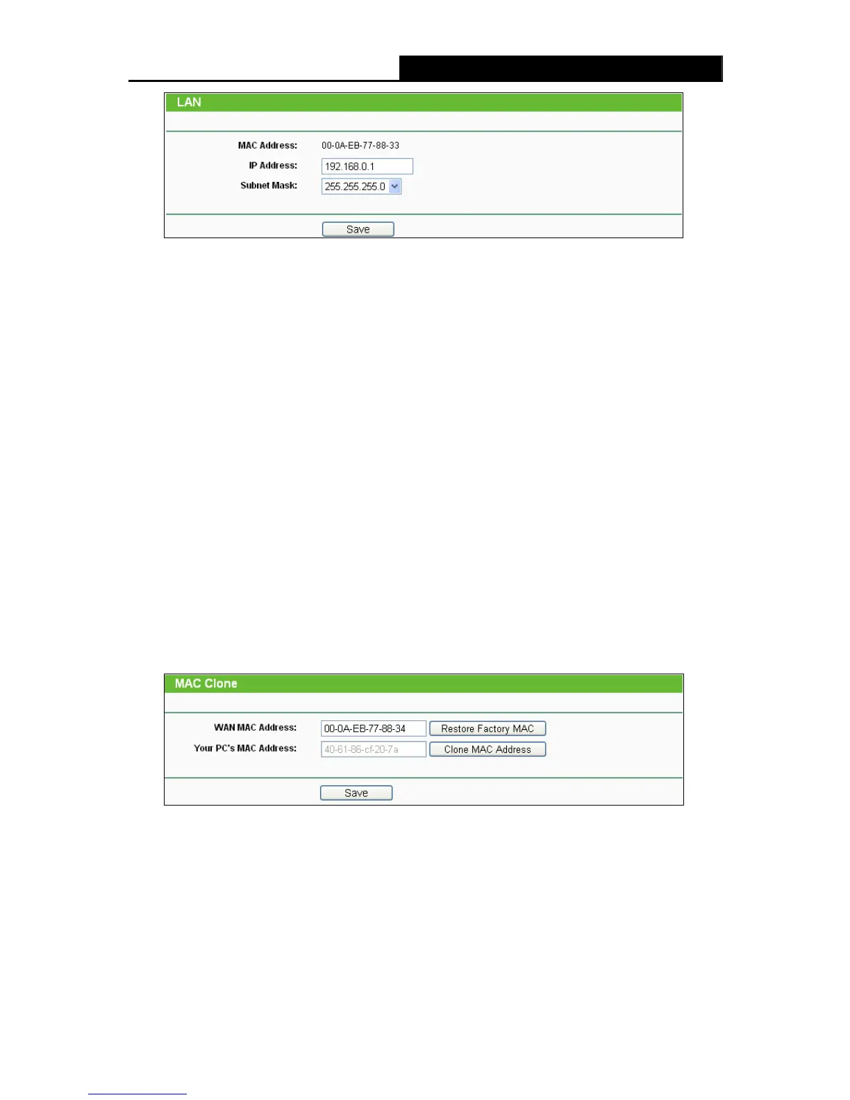 Choose menu “Network → MAC Clone”, you can configure the MAC address of the WAN on