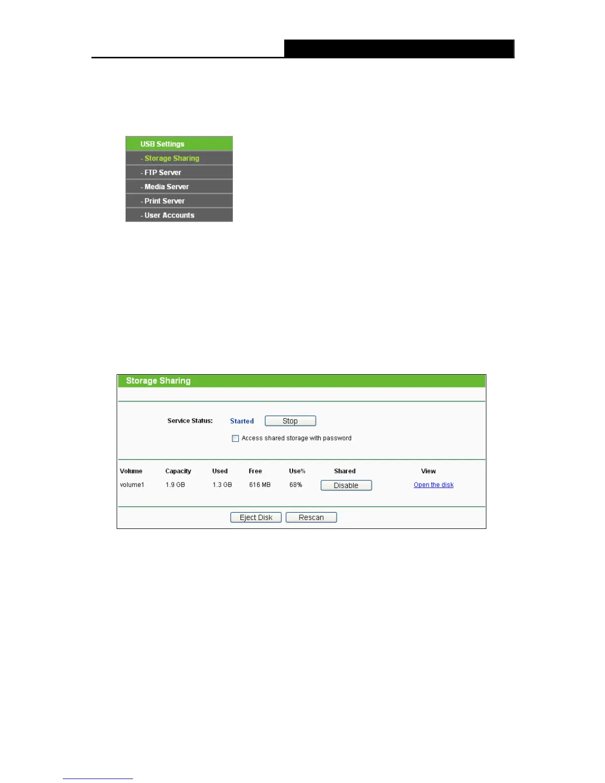 There are four submenus under the USB Settings menu (shown in Figure 4-33), Storage Sharing,