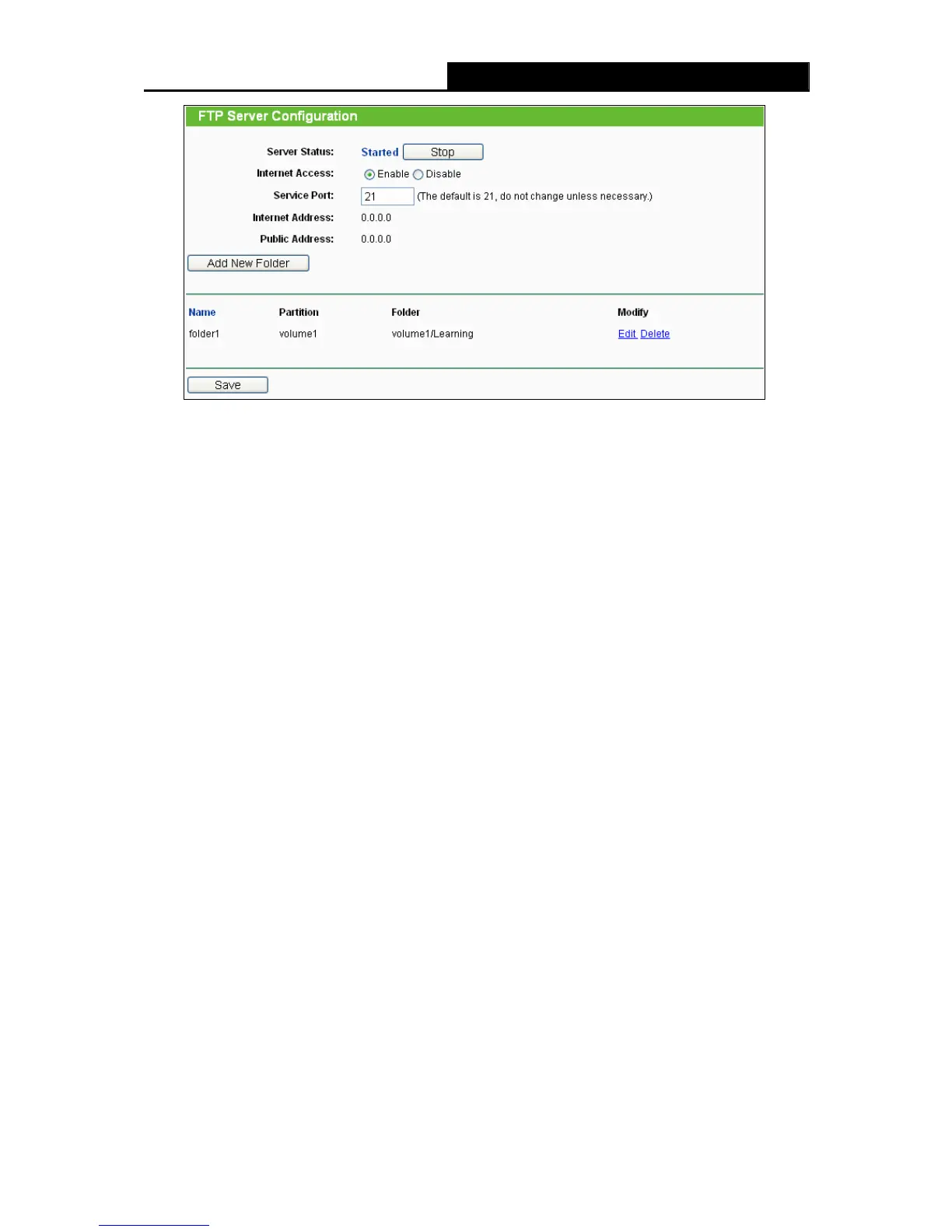 ¾ Internet Access - Select enable to allow access of the FTP server from the Internet.