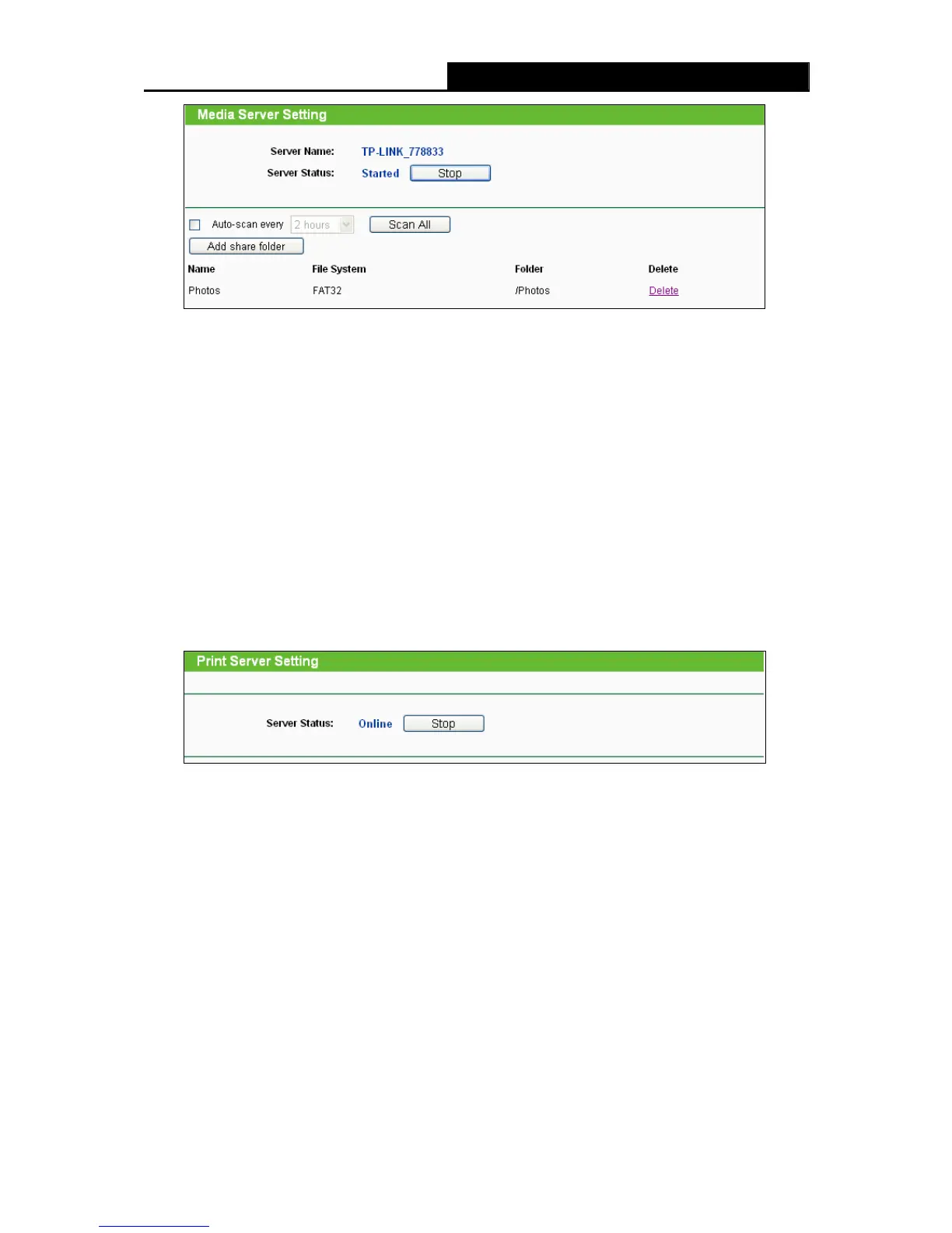 Choose menu “USB Settings→Print Server”, you can configure print server on this page as
