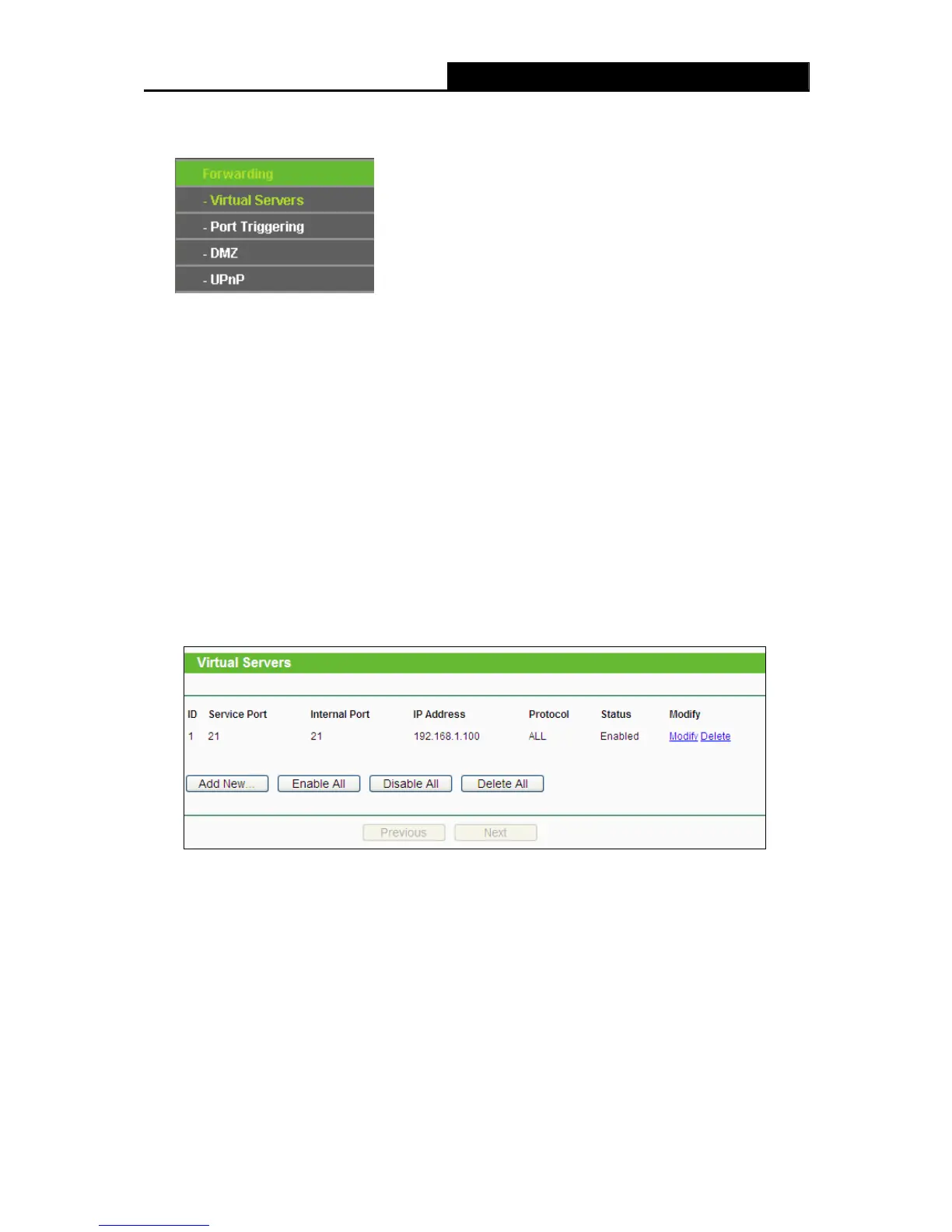 Choose menu “Forwarding→Virtual Servers”, and then you can view and add virtual servers in