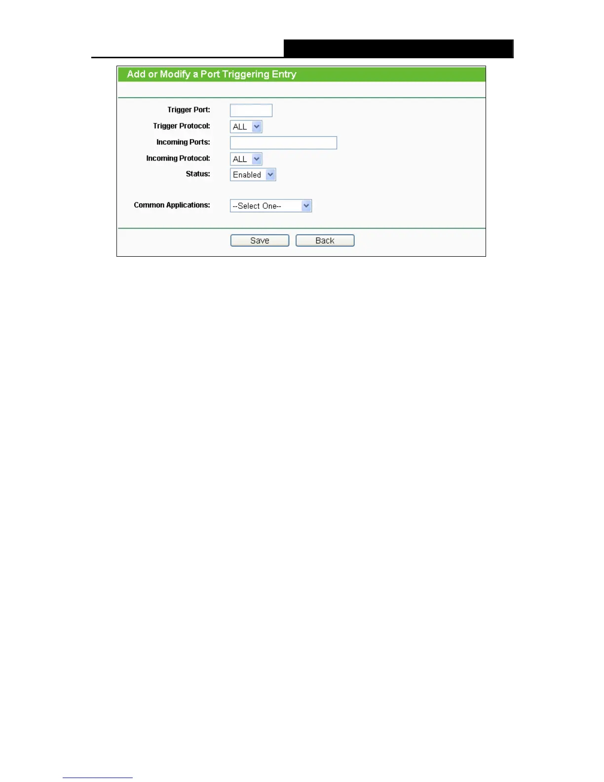 ¾ Status - The status of this entry, Enabled means the Port Triggering entry is enabled.