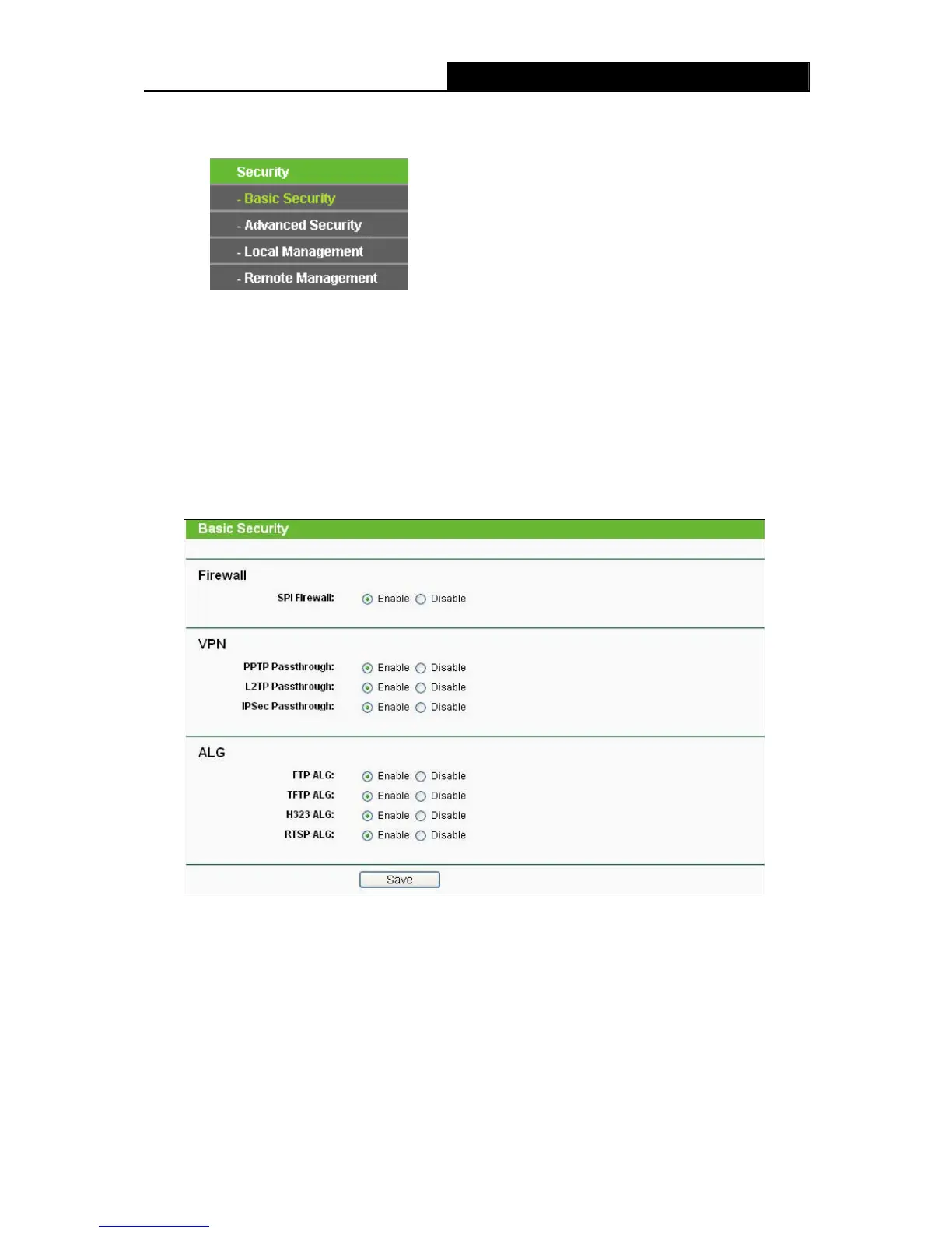 Choose menu “Security → Basic Security”, and then you can configure the basic security in the