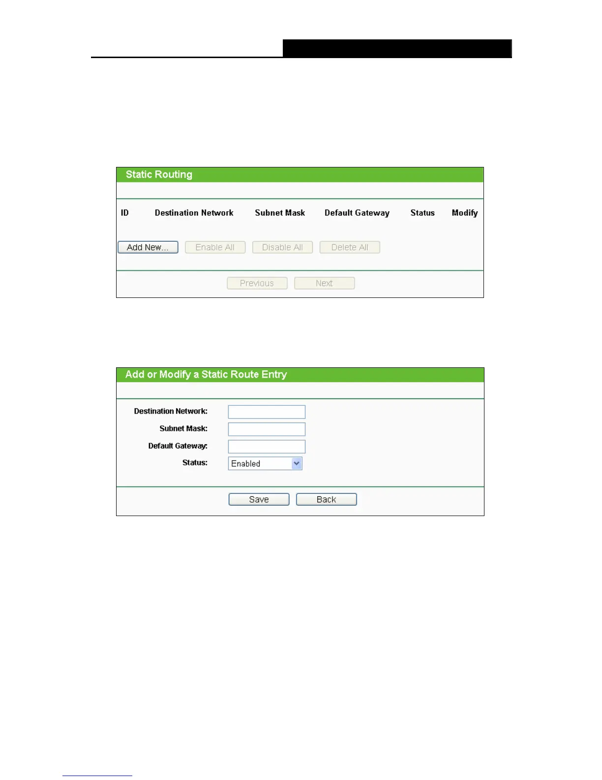 Choose menu “Advanced Routing → Static Routing List”, and then you can configure the