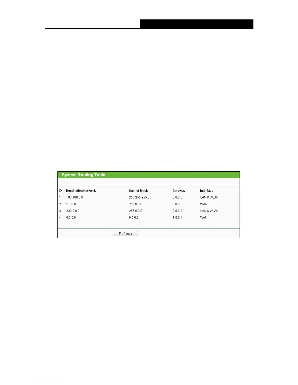 the valid route entries in use. The Destination IP address, Subnet Mask, Gateway, and Interface