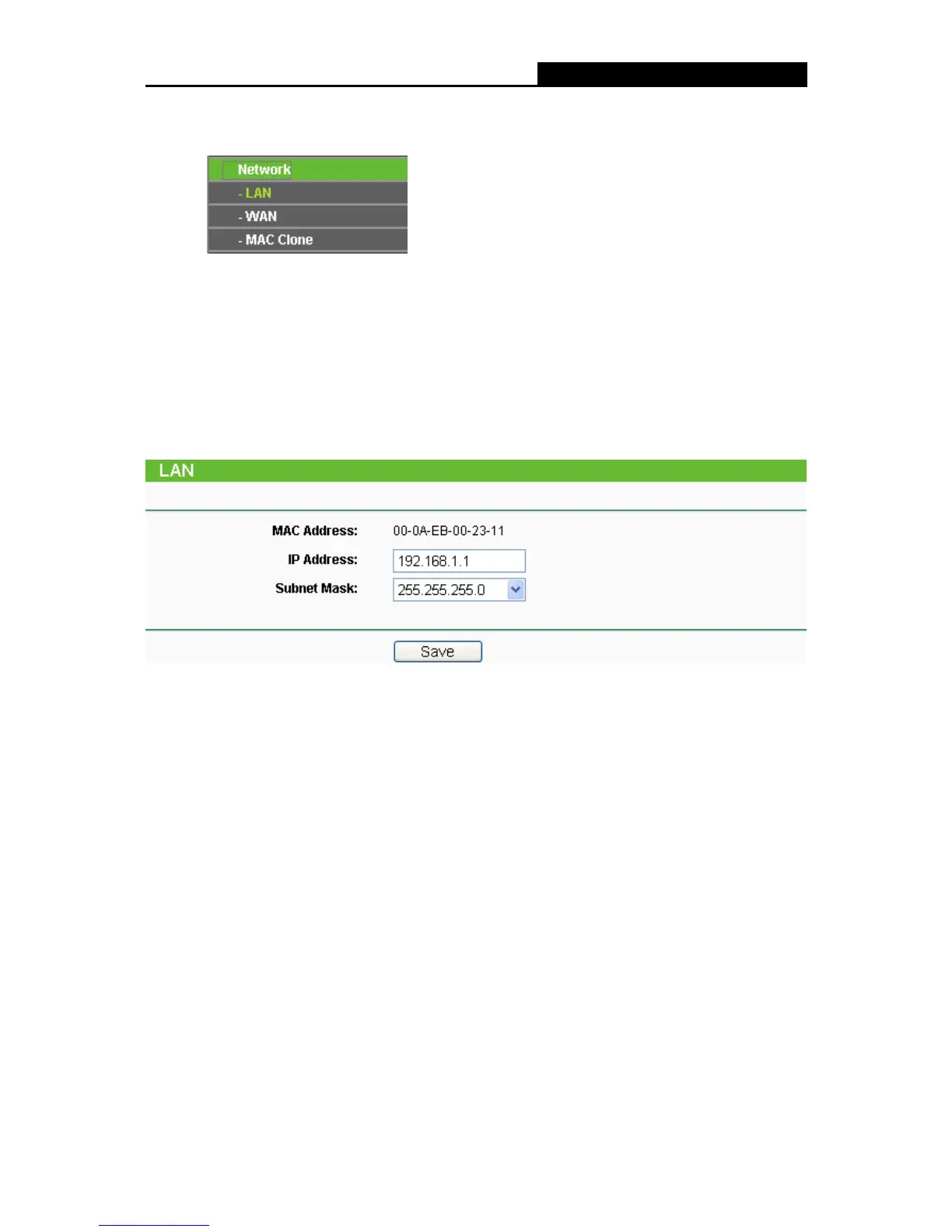 In meniul Network (Retea) exista trei sub-meniuri, afisate in Figura 3-2: LAN, WAN si MAC Clone.