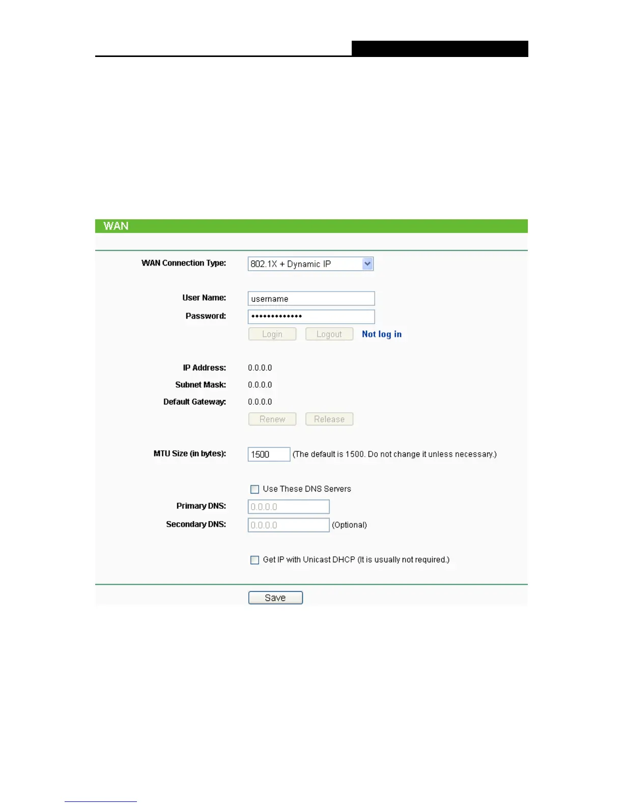 4. Daca selectati 802.1X + Dynamic IP, trebuie sa introduceti urmatorii parametri (Figura 3-8) :