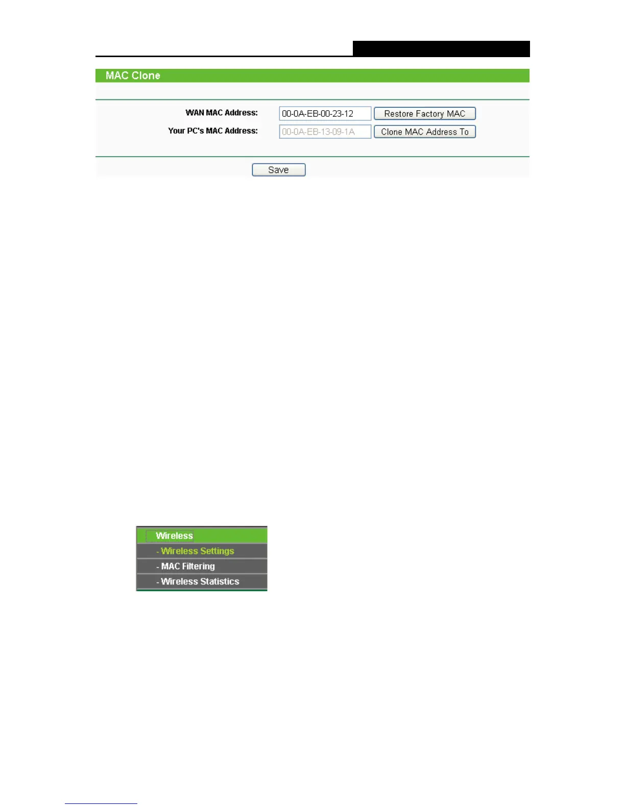 In meniul Wireless exista trei sub-meniuri, afisate in Figura 3-16: Wireless Settings, MAC