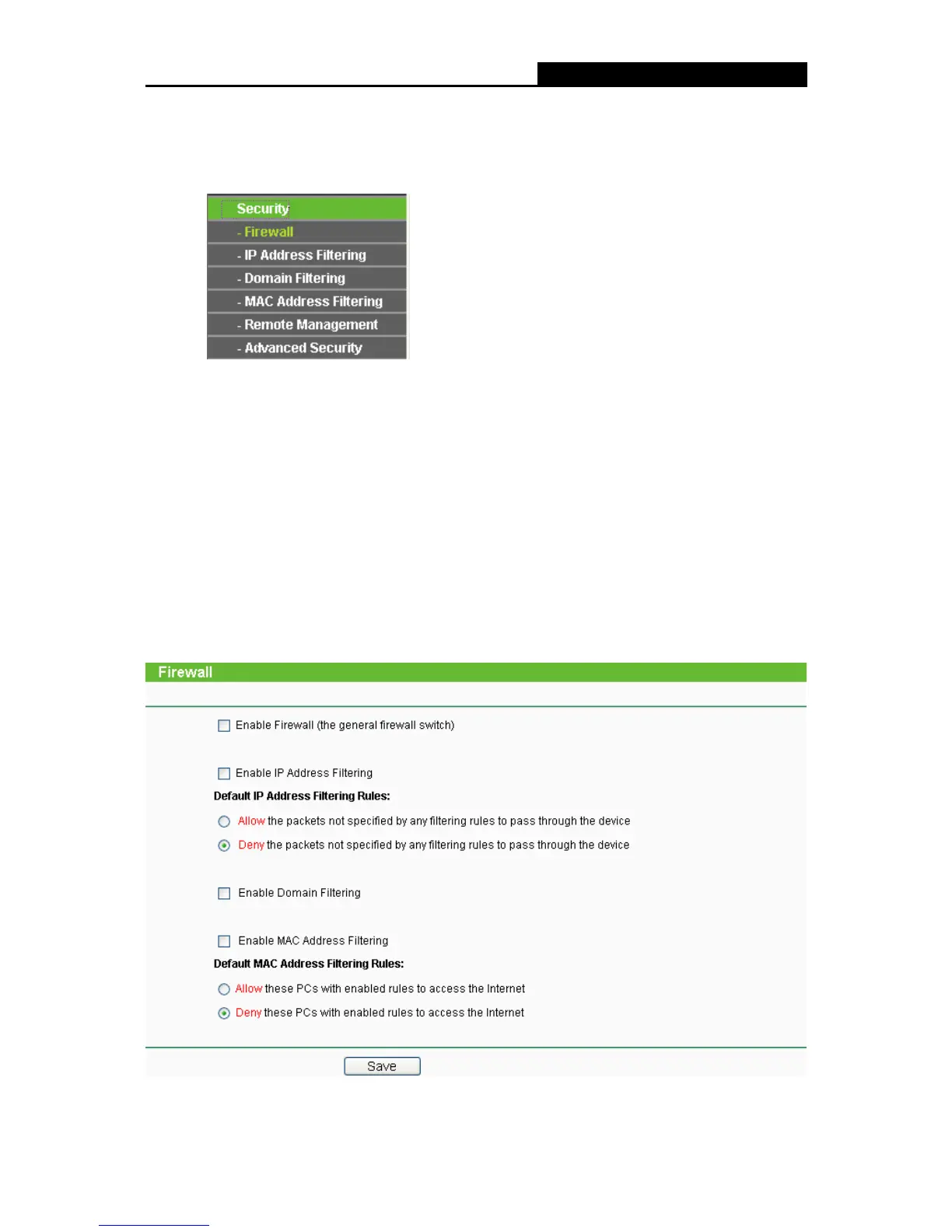 In meniul Security se gasesc sase submeniuri (ilustatrate in Figura 3-36): Firewall, IP Address
