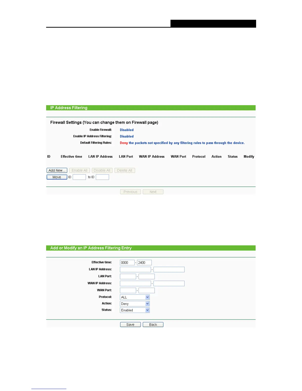 Firewall, apoi apasati butonul Add New… Pagina “Add or Modify an IP Address Filtering