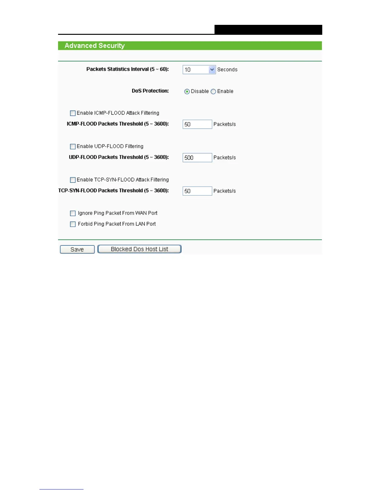 DoS protection – Enable (activare) sau Disable (dezactivare) functia de protectie DoS.