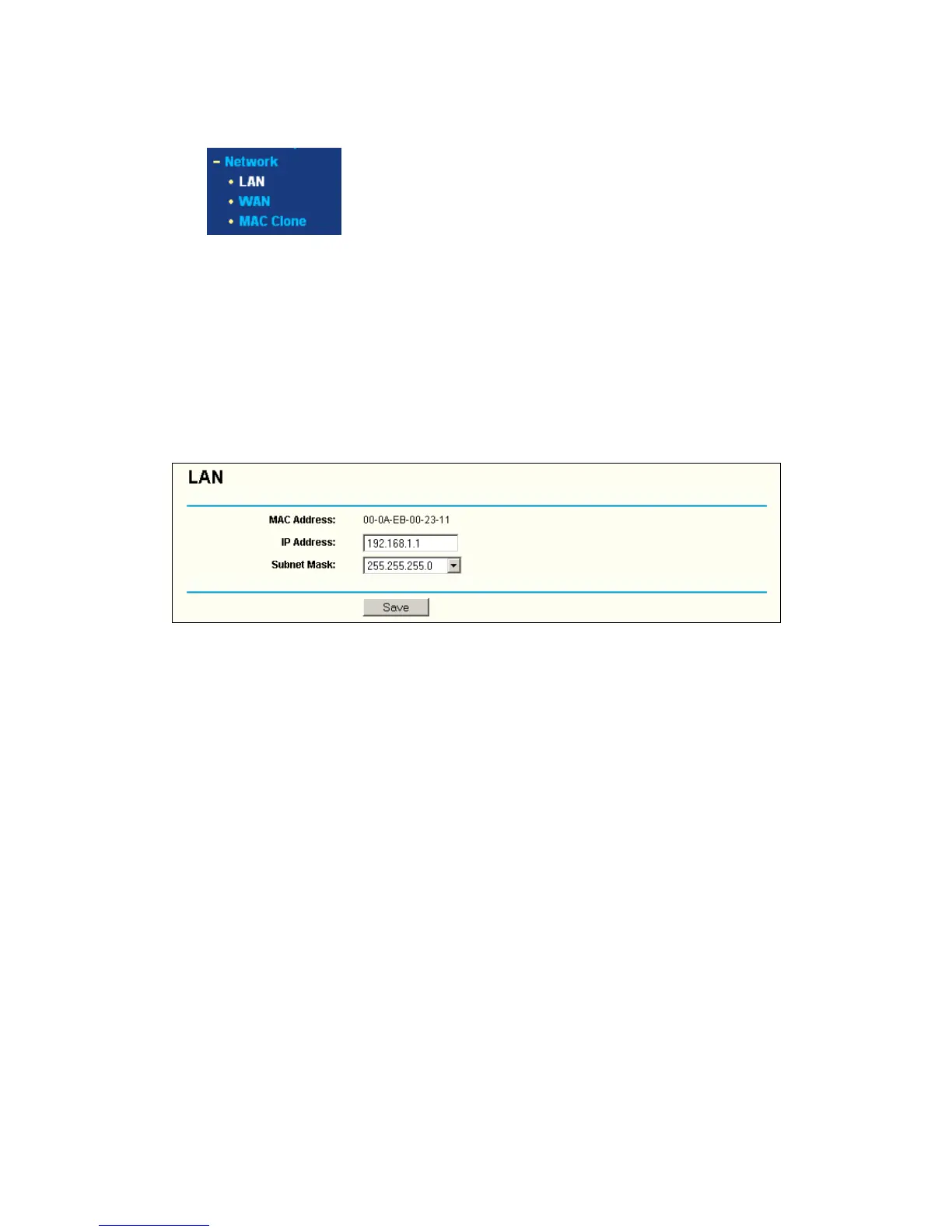 There are three submenus under the Network menu (shown in Figure 4-2): LAN, WAN and MAC