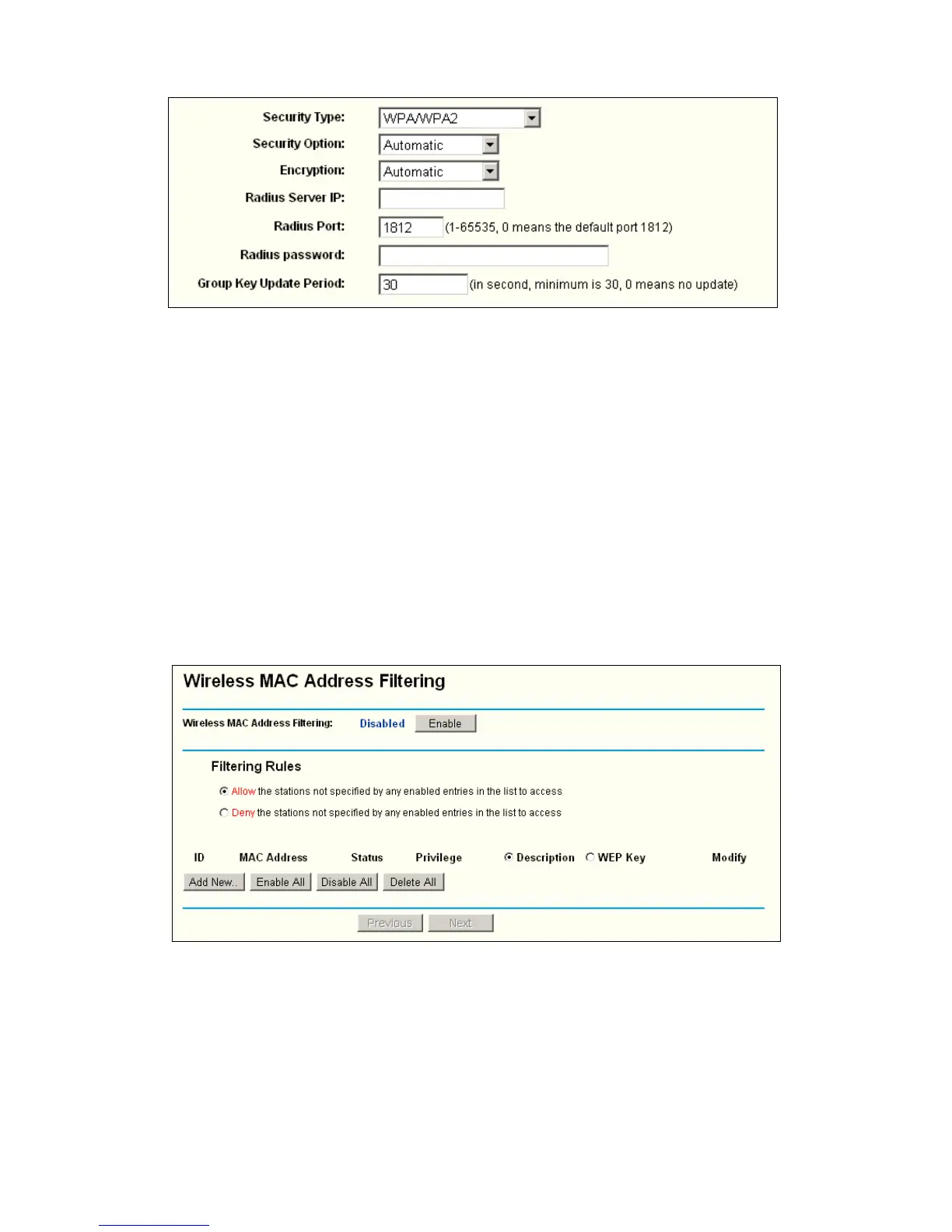 The Wireless MAC Filtering for wireless networks is set on this page, Figure 4-18: