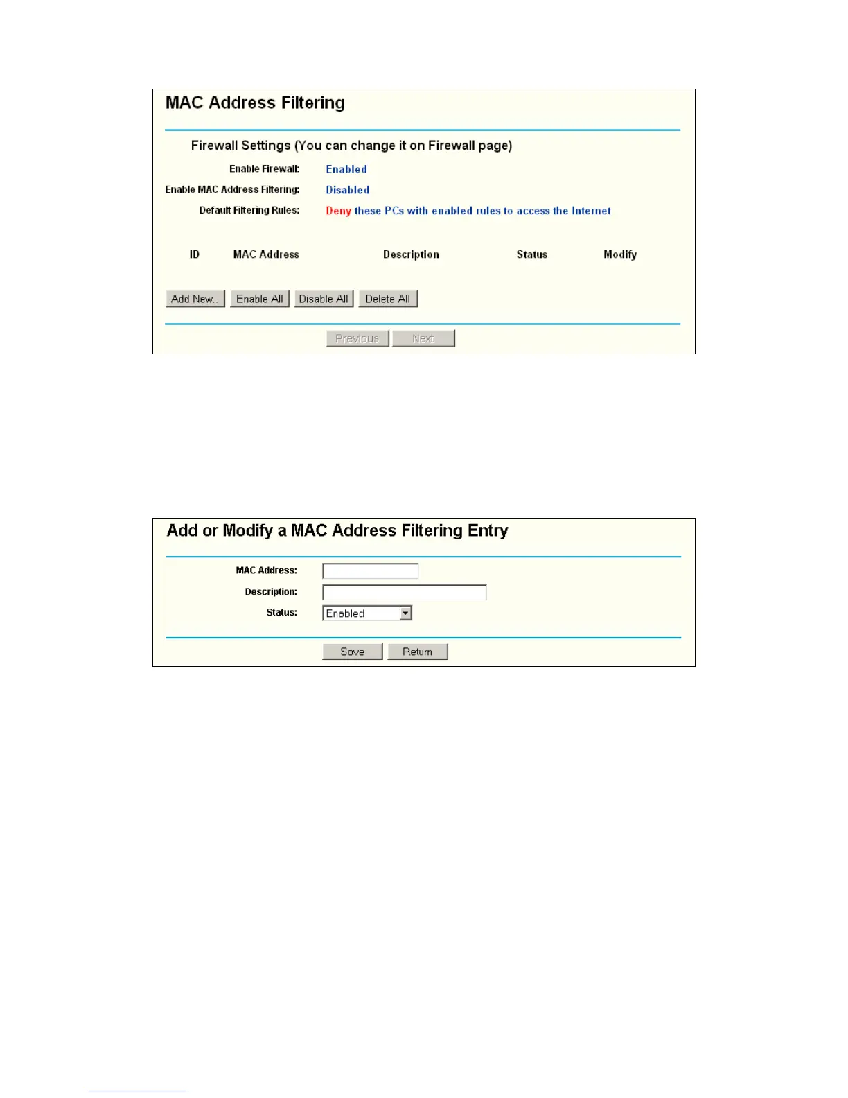 Before setting up MAC Filtering entries, you must ensure that Enable Firewall and Enable MAC