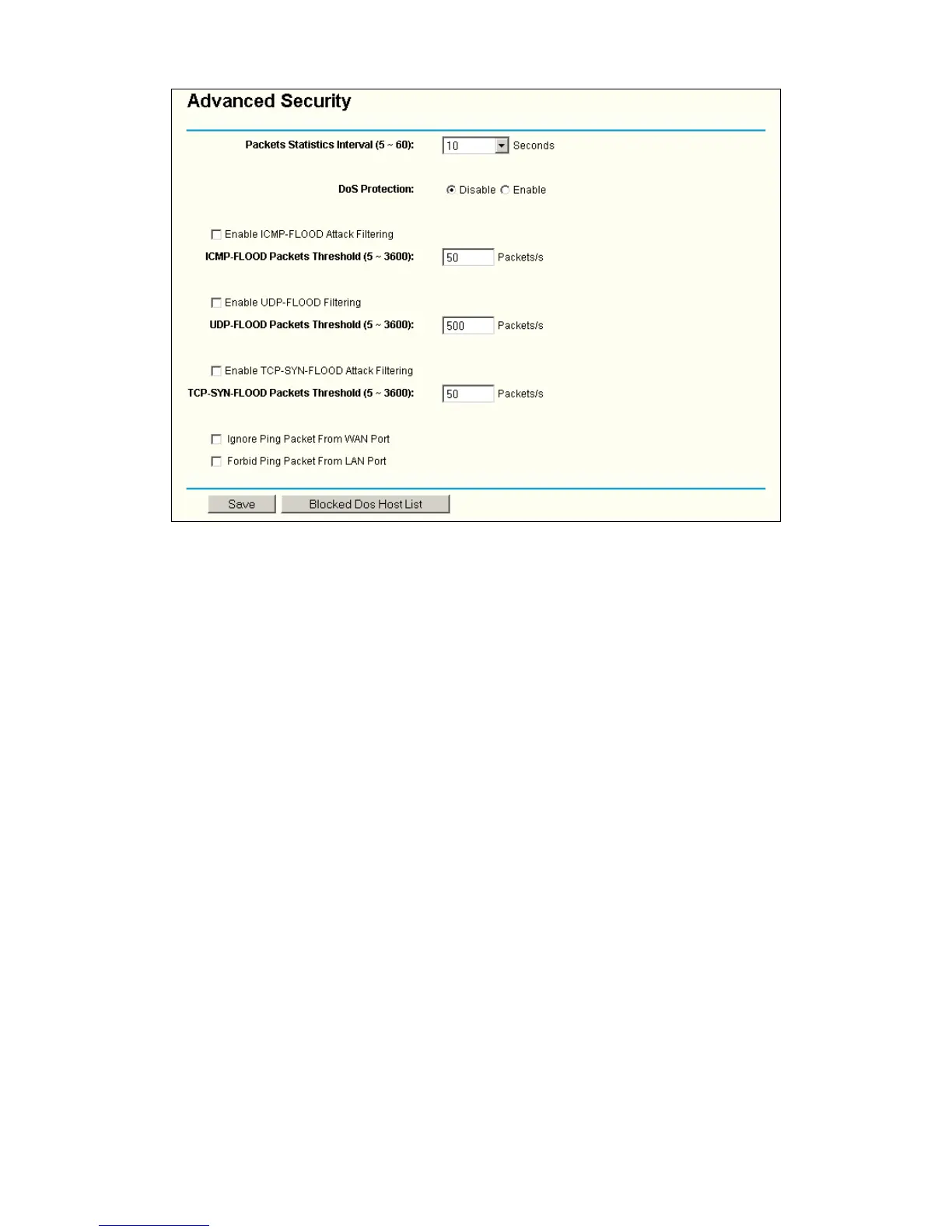 ¾ UDP-FLOOD Packets threshold: (5 ~ 3600) - The default value is 50. Enter a value