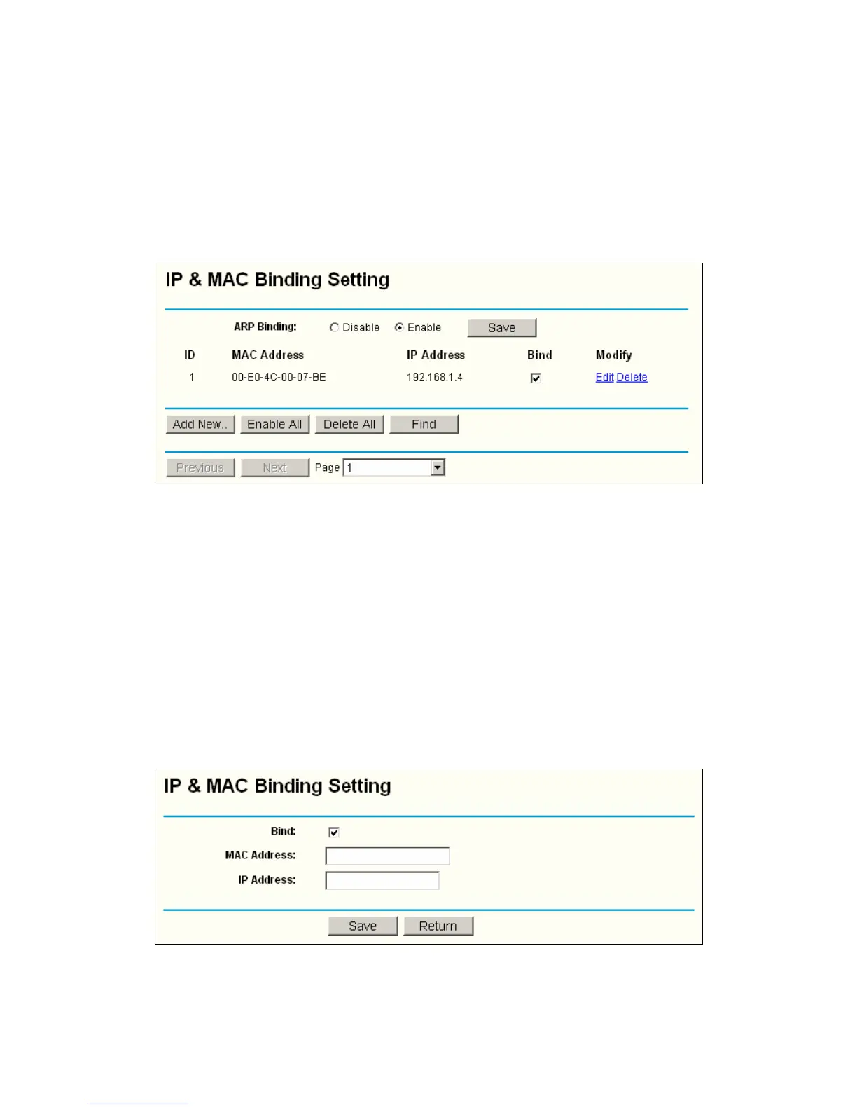 This page displays the IP & MAC Binding Setting table; you can operate it in accord with your