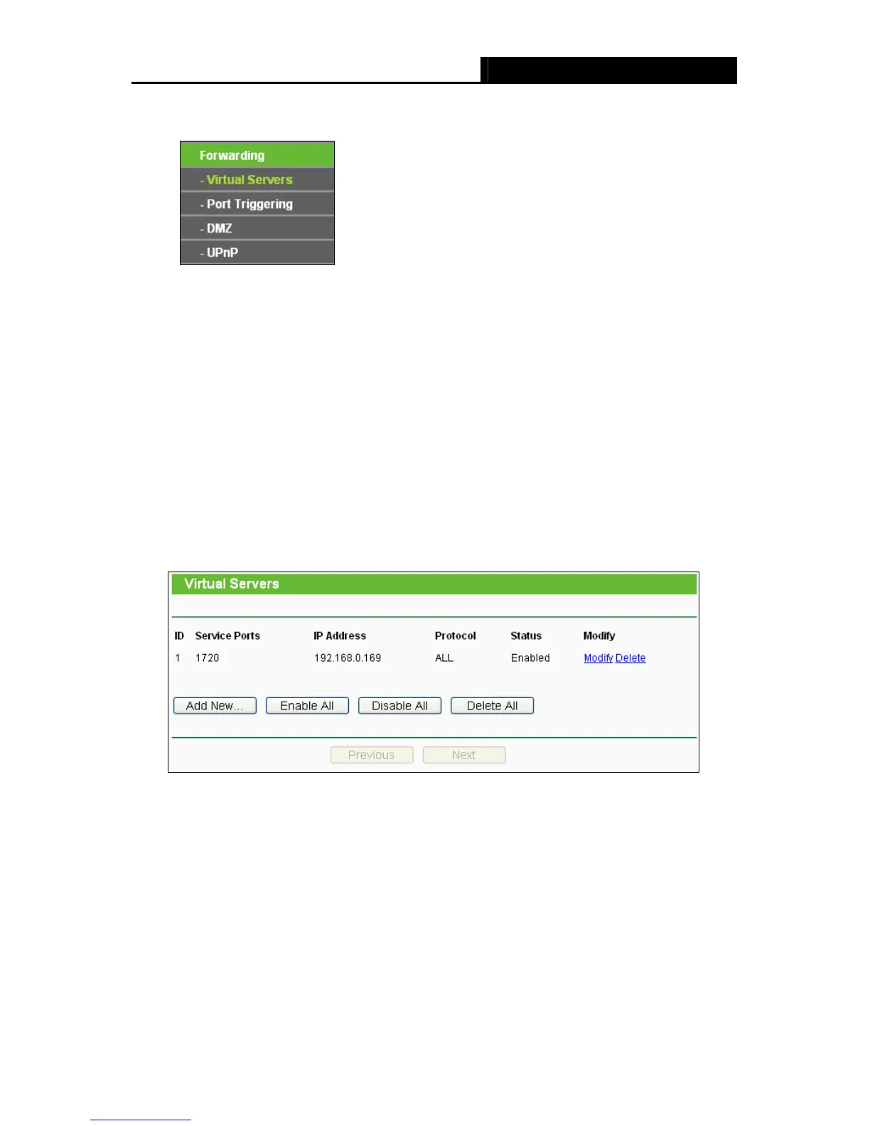 Choose menu “Forwarding → Virtual Servers”, and then you can view and add virtual servers