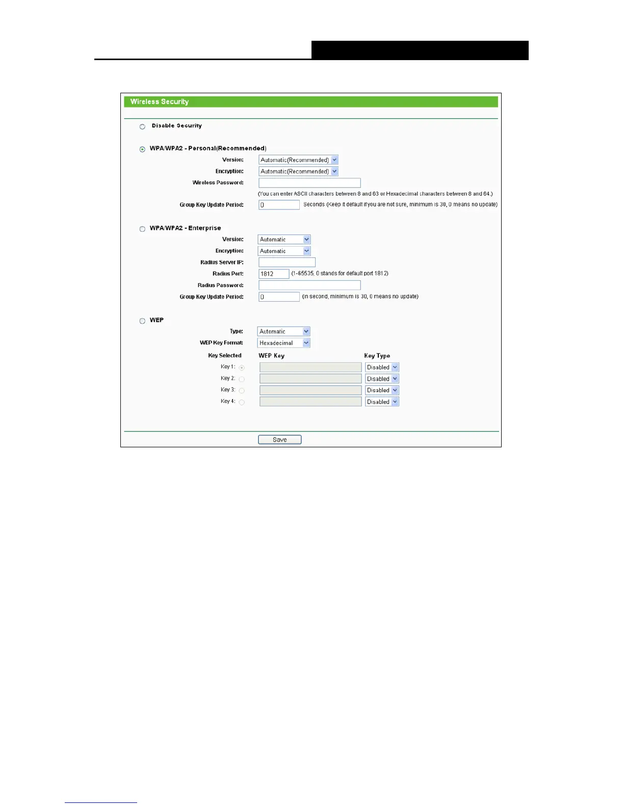 ¾ Disable Security - The wireless security function can be enabled or disabled. If disabled, the