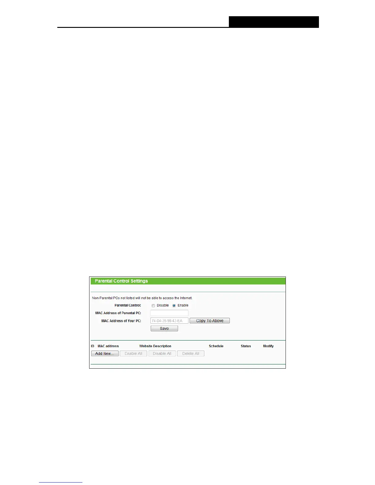 MAC Address of Parental PC - In this field, enter the MAC address of the controlling PC, or