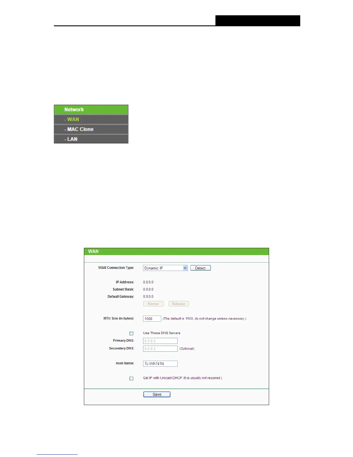 There are three submenus under the Network menu (shown in Figure 4-6): WAN, MAC Clone and