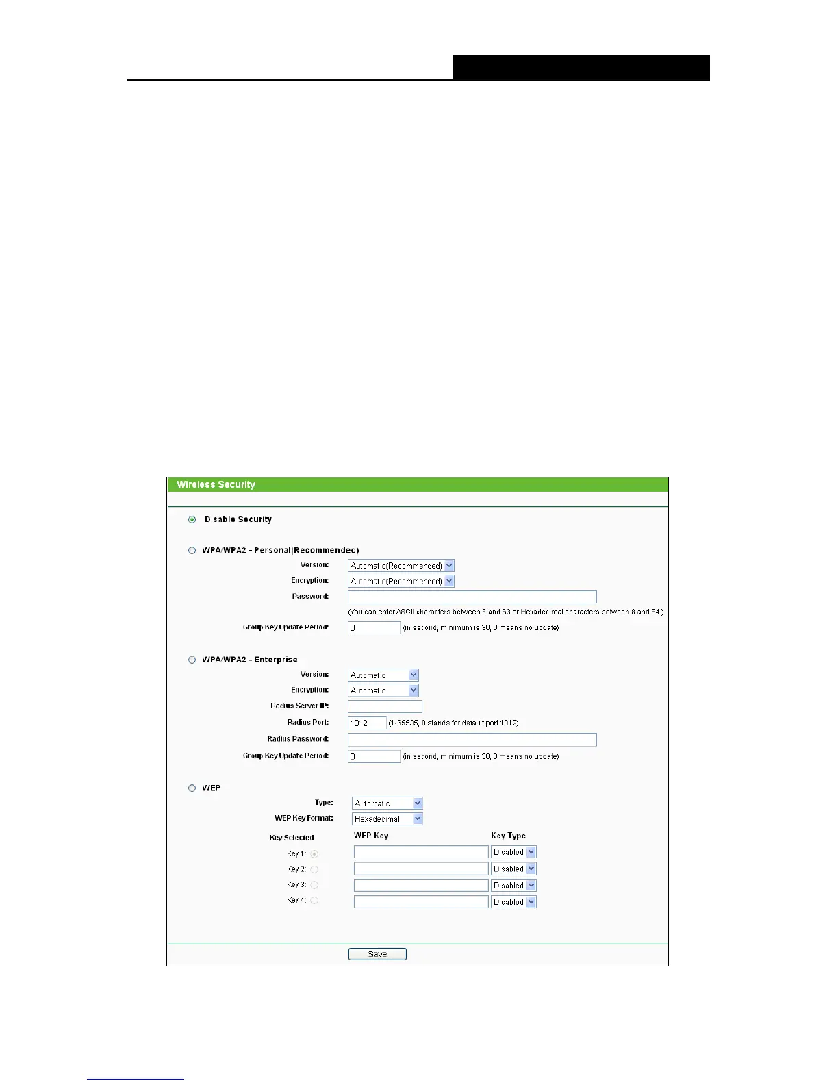 Choose menu “Wireless → Wireless Security”, and then you can configure the security