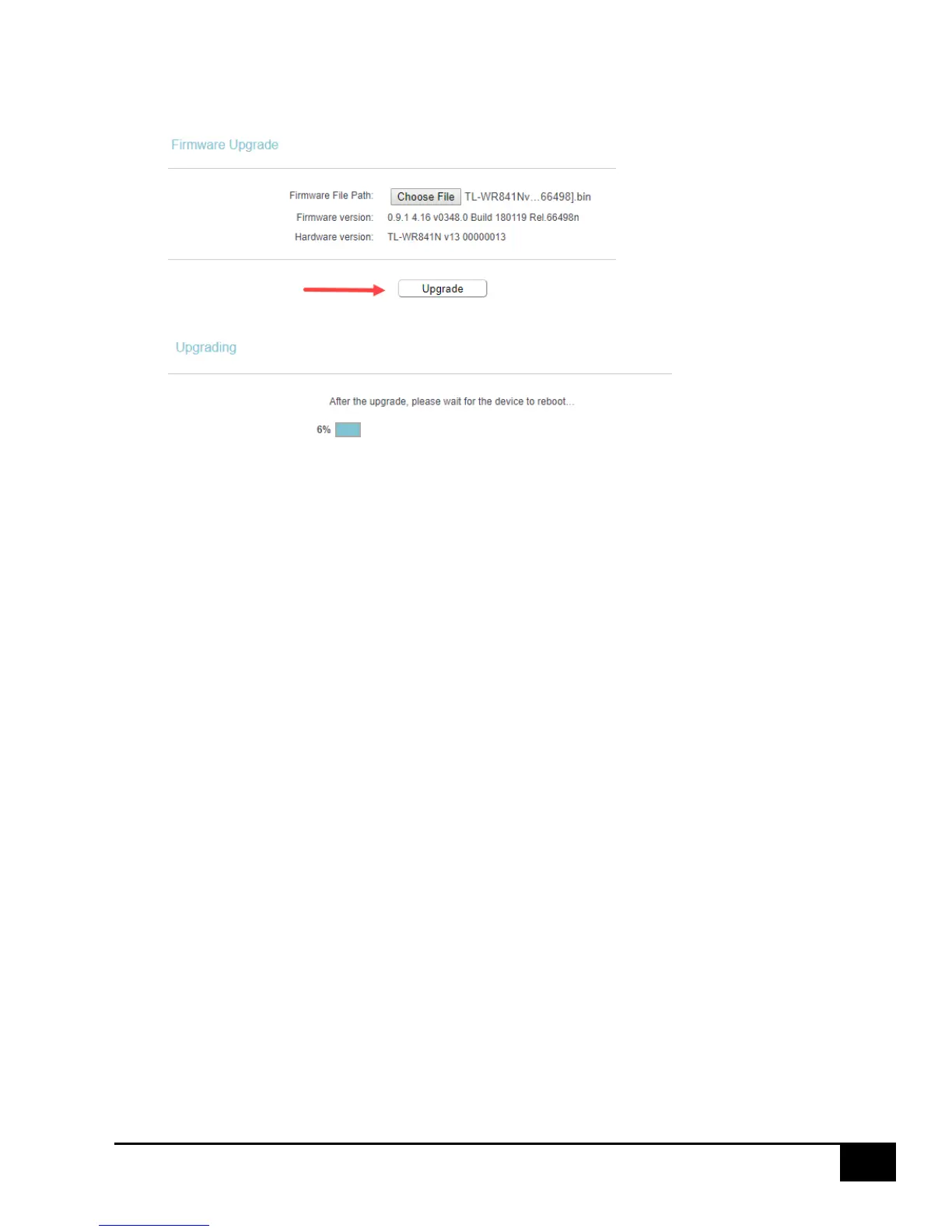 The upgrade will be installed on the router. Once complete, the router will automatically reboot.