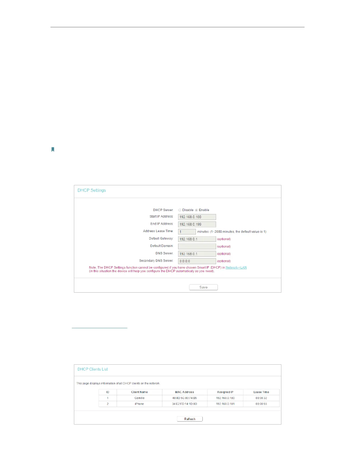 • When you choose Smart IP(DHCP) in Network > LAN, the DHCP Server function will be disabled. You will see the page