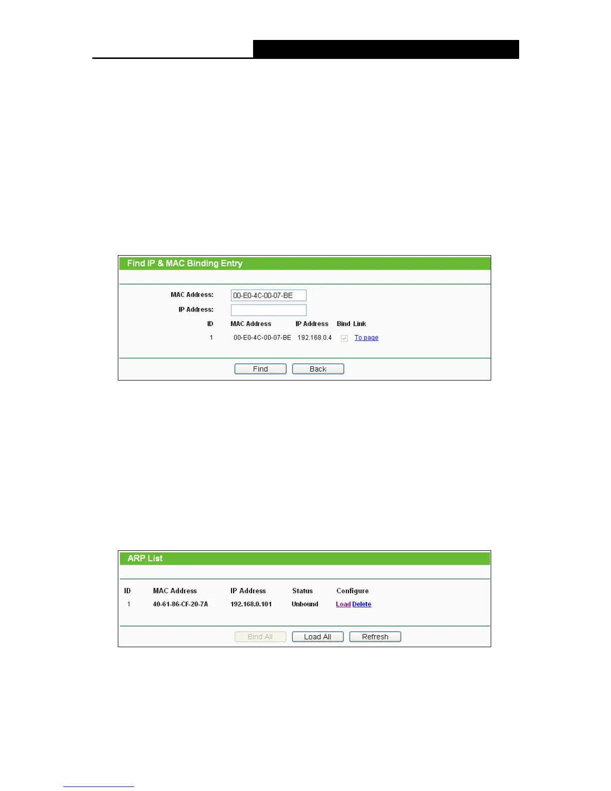 items on the ARP list. This page displays the ARP List; it shows all the existing IP & MAC Binding
