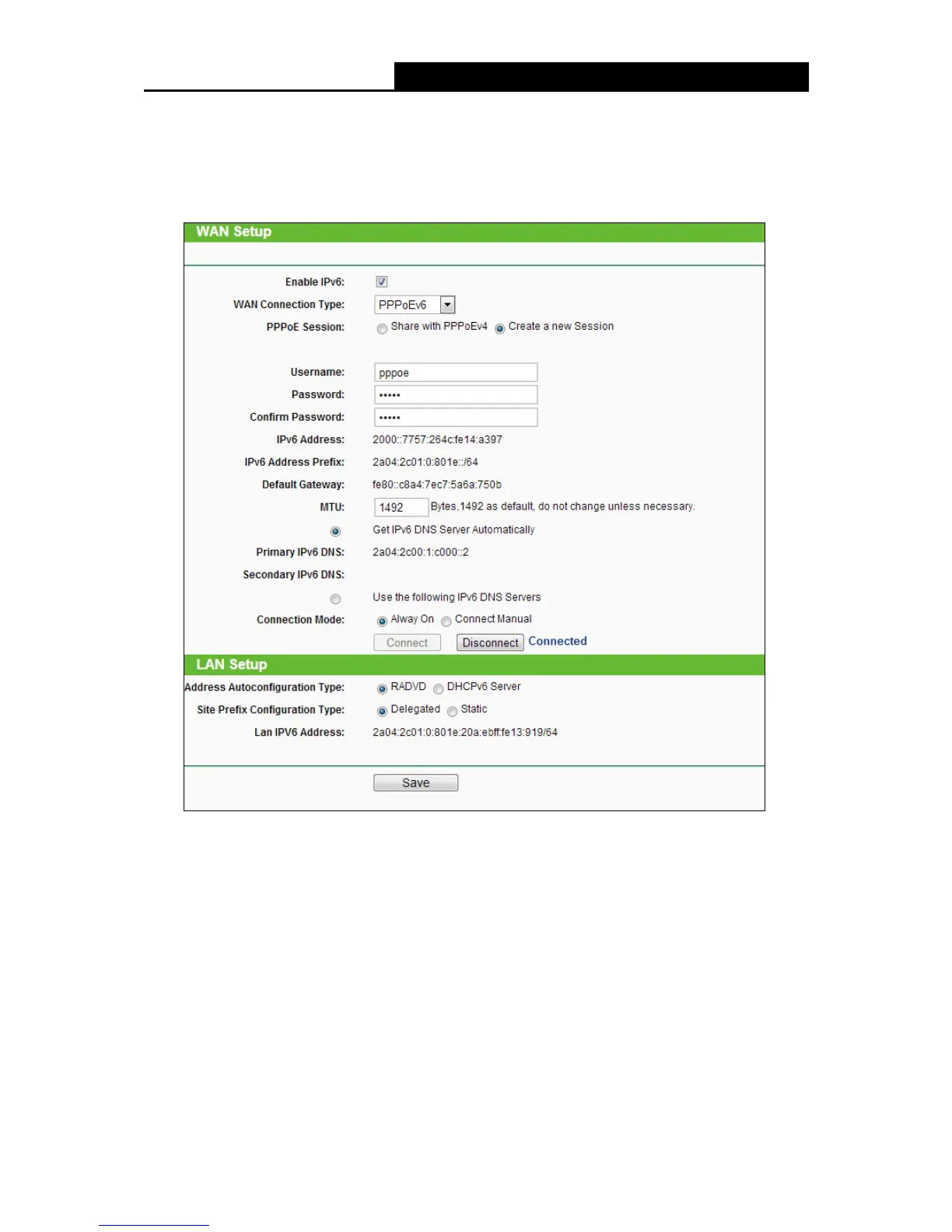 PPPoE Session - The PPP session type for IPv6 connection. There are two types: