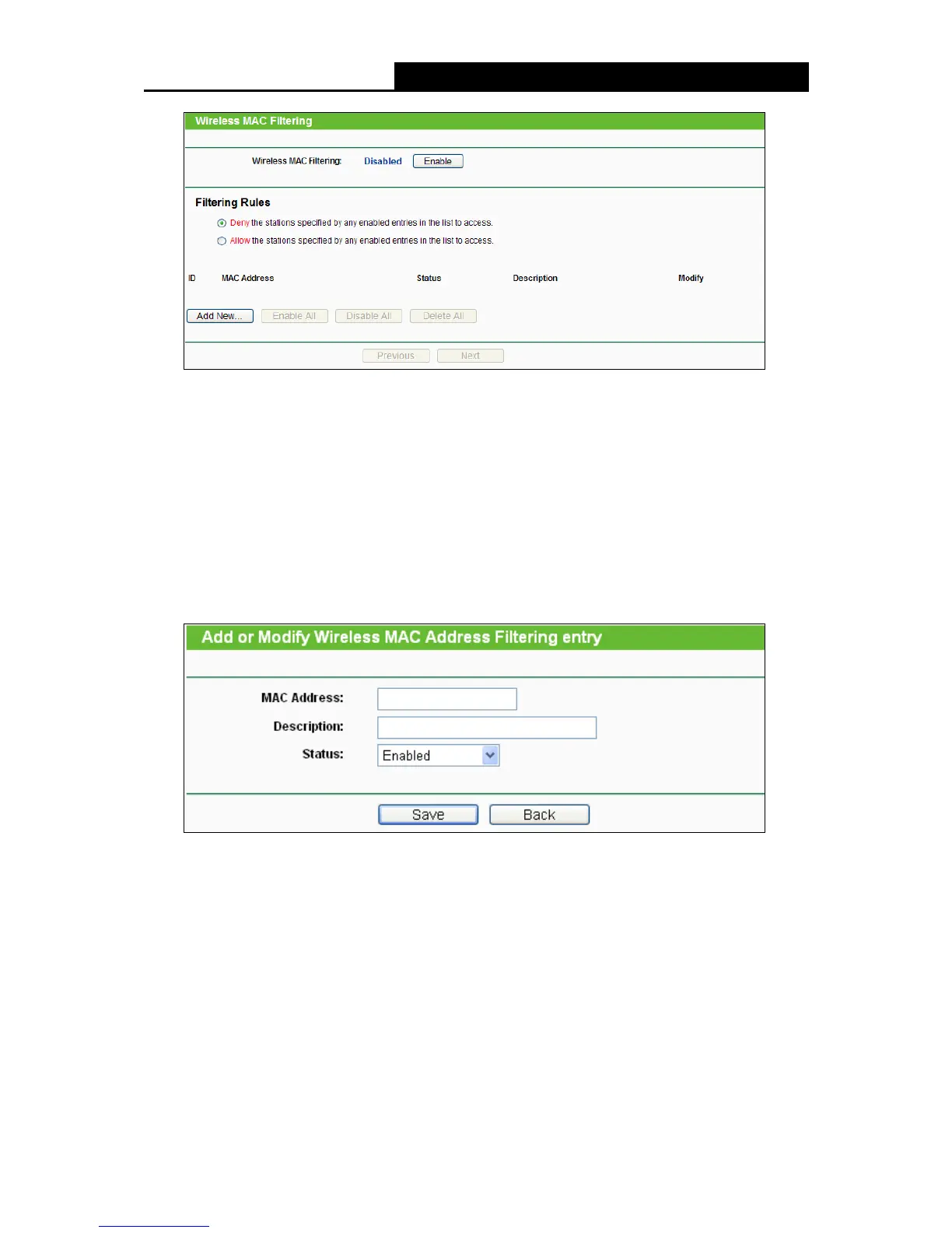 To filter wireless users by MAC Address, click Enable. The default setting is Disabled.