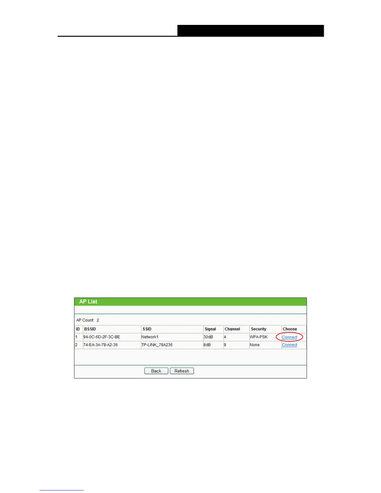 Click Survey button on the Wireless page shown as Figure 4-18, and then AP List page will