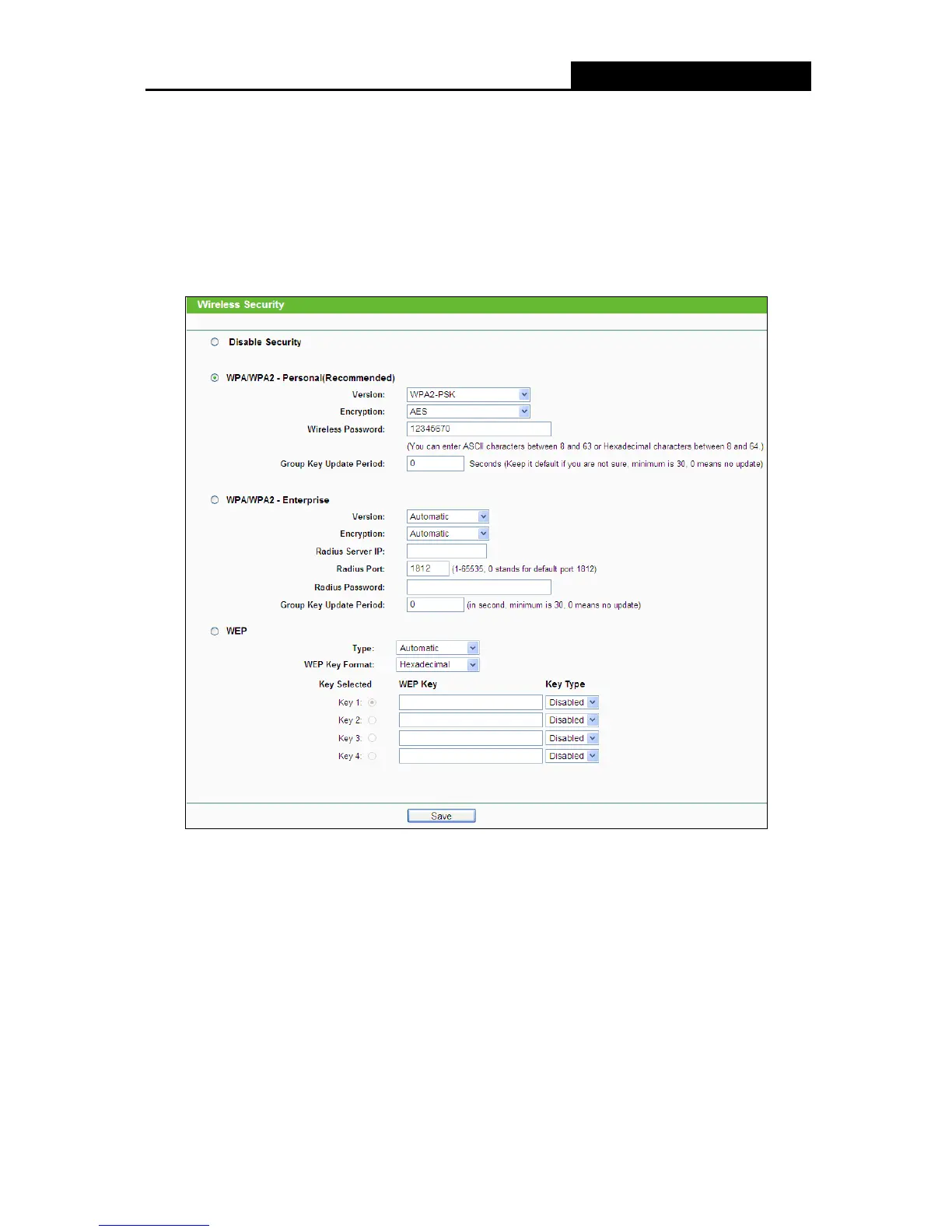 Choose menu “Wireless > Wireless Security”, you can configure the security settings of your