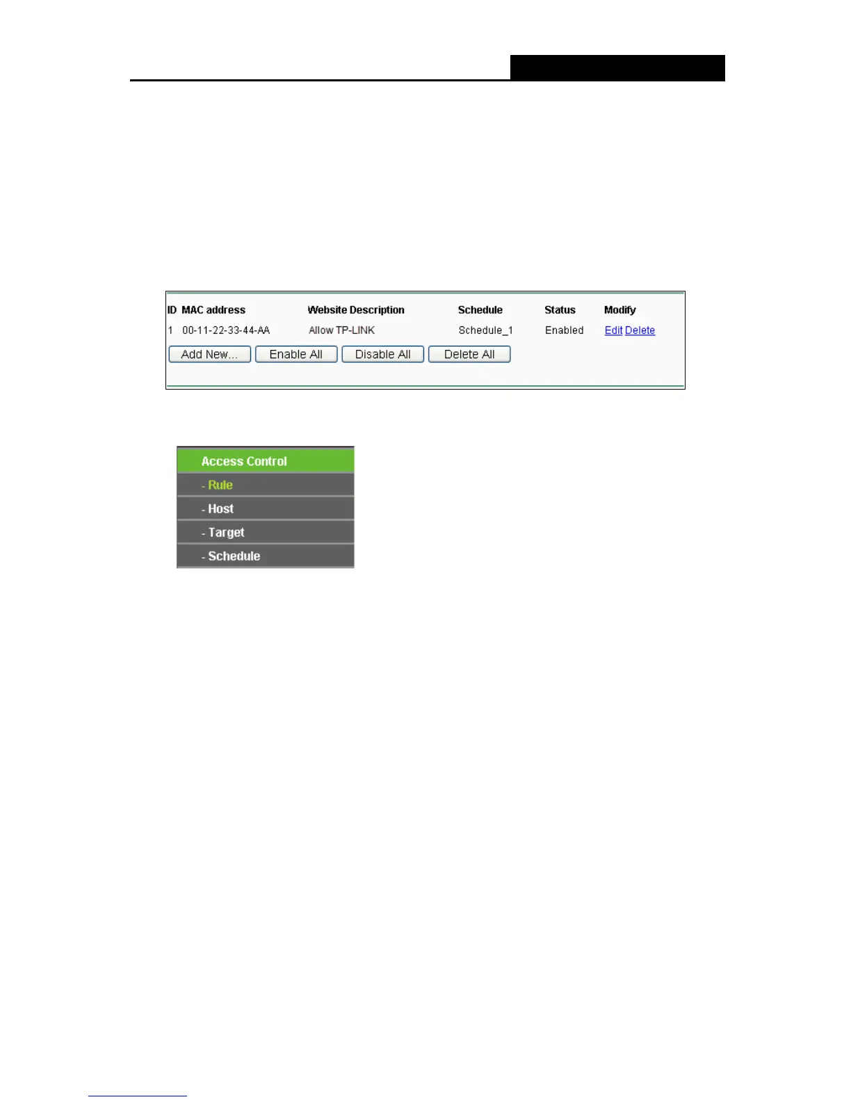 There are four submenus under the Access Control menu: Rule, Host, Target and Schedule.
