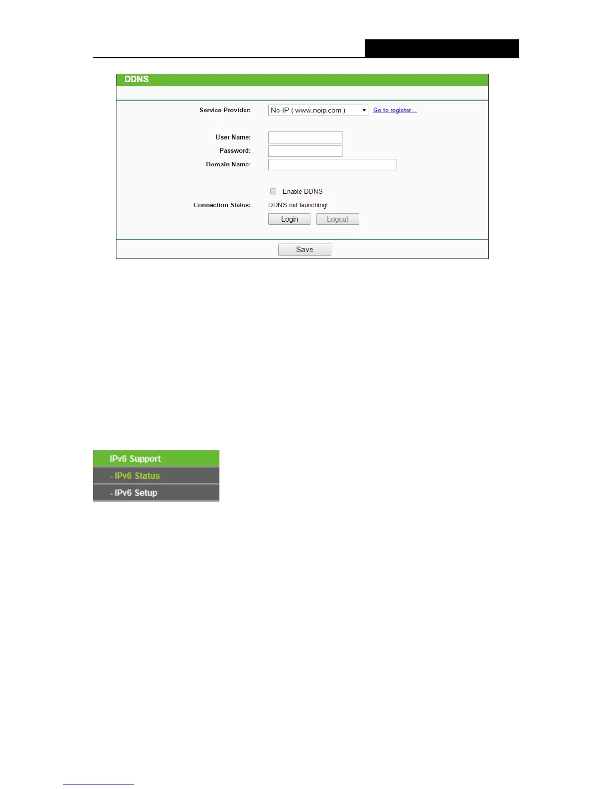 There are two submenus under the IPv6 Support menu: IPv6 Status and IPv6 Setup. Click either