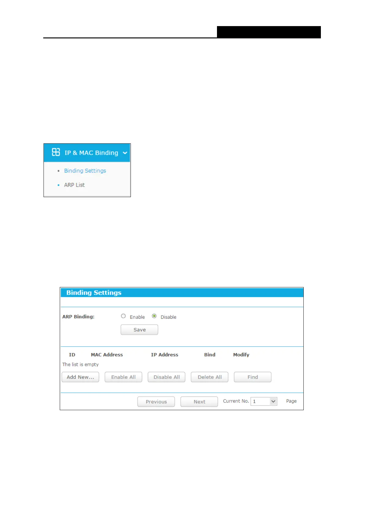 There are two submenus under the IP & MAC Binding menu: Binding Setting and ARP List.