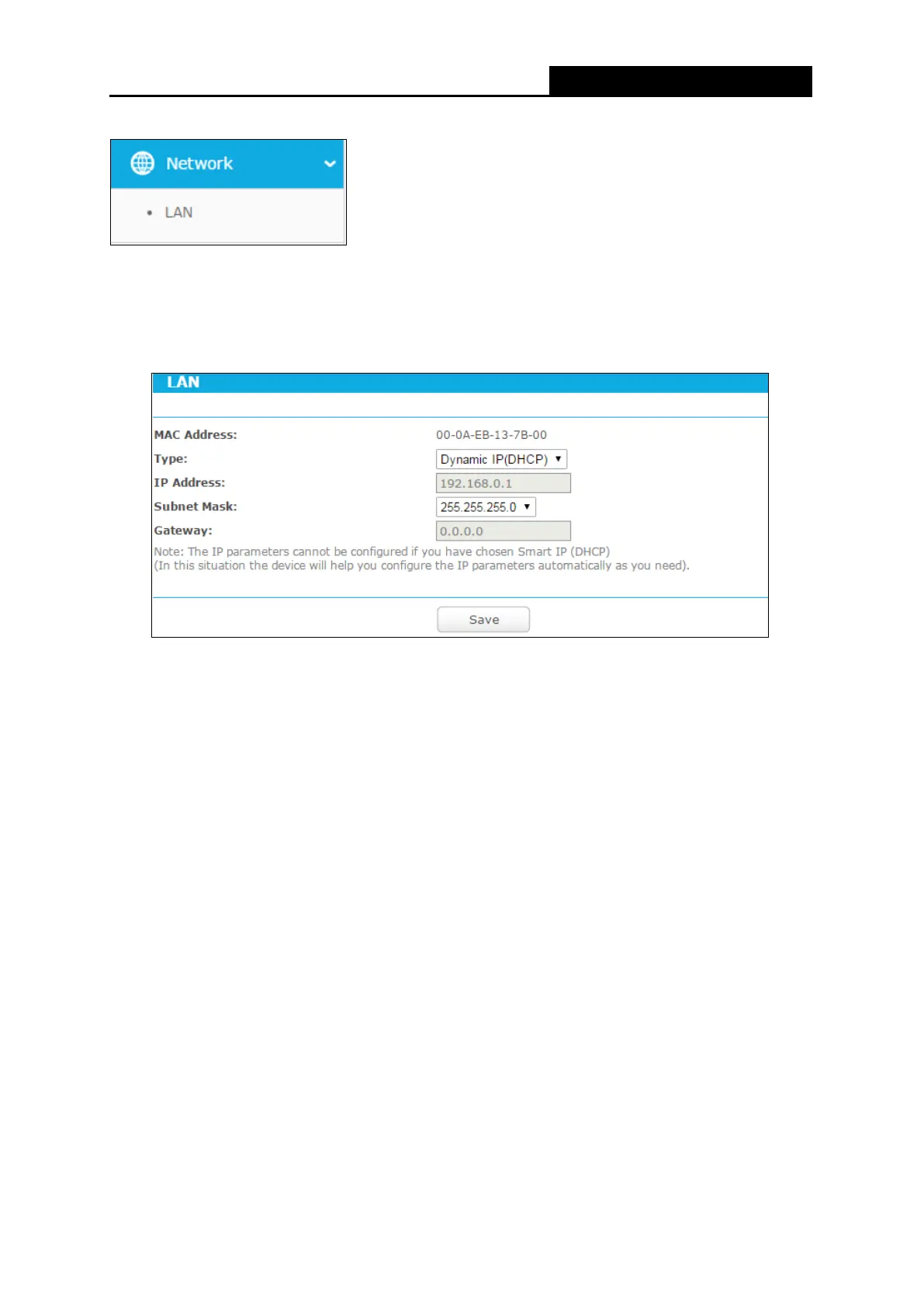 There is only one submenu under the Network menu: LAN.