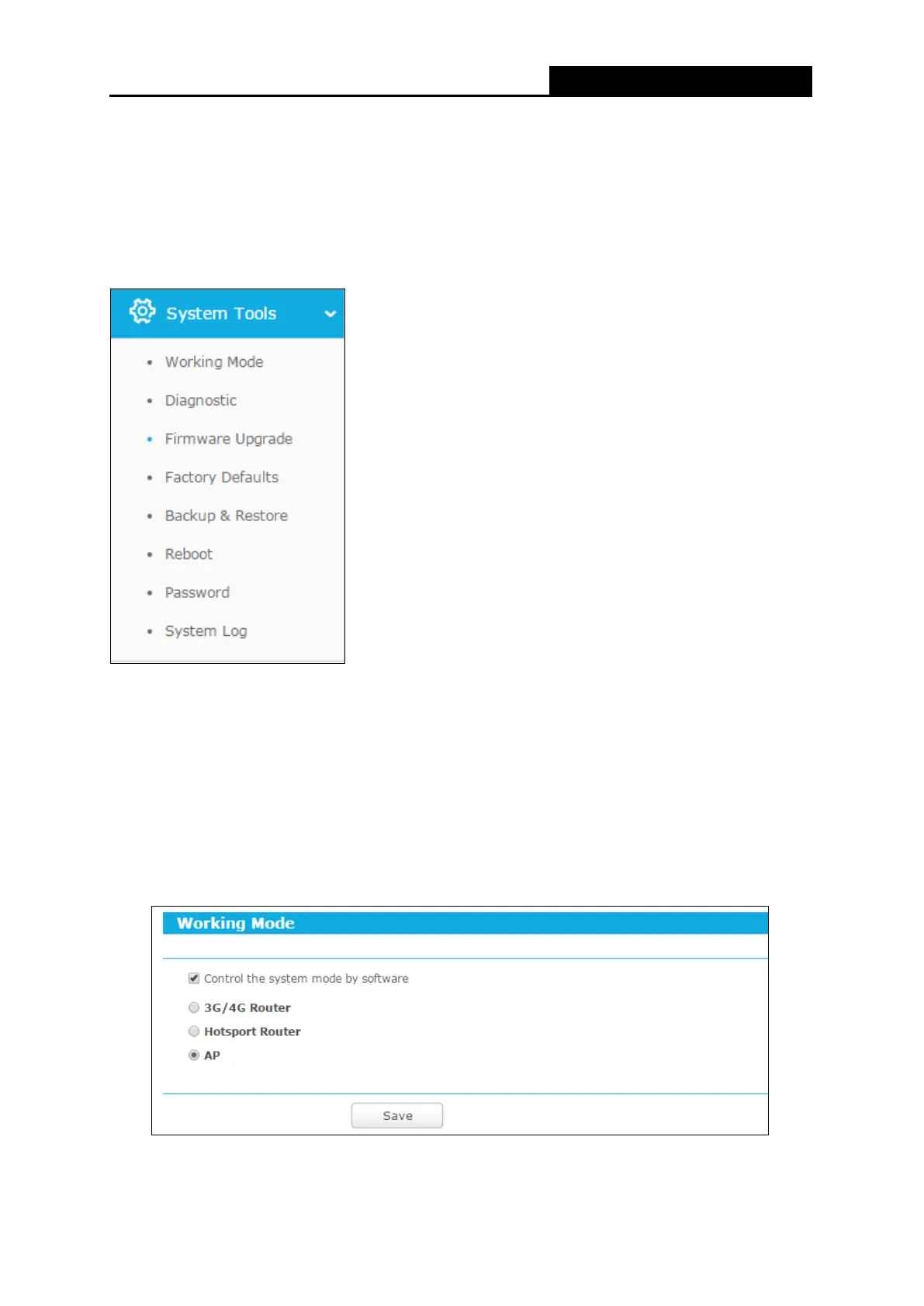 Working Mode, Diagnostic, Firmware Upgrade, Factory Defaults, Backup & Restore,