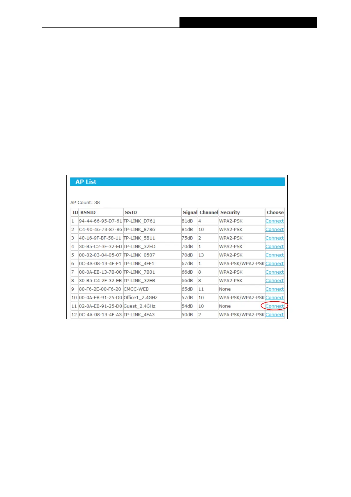 Find the SSID of the AP you want to access, and click Connect in the corresponding row. For