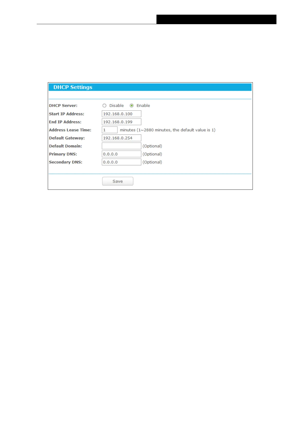 Go to “Setting→DHCP→DHCP Settings”, and then you can configure the DHCP Server on the
