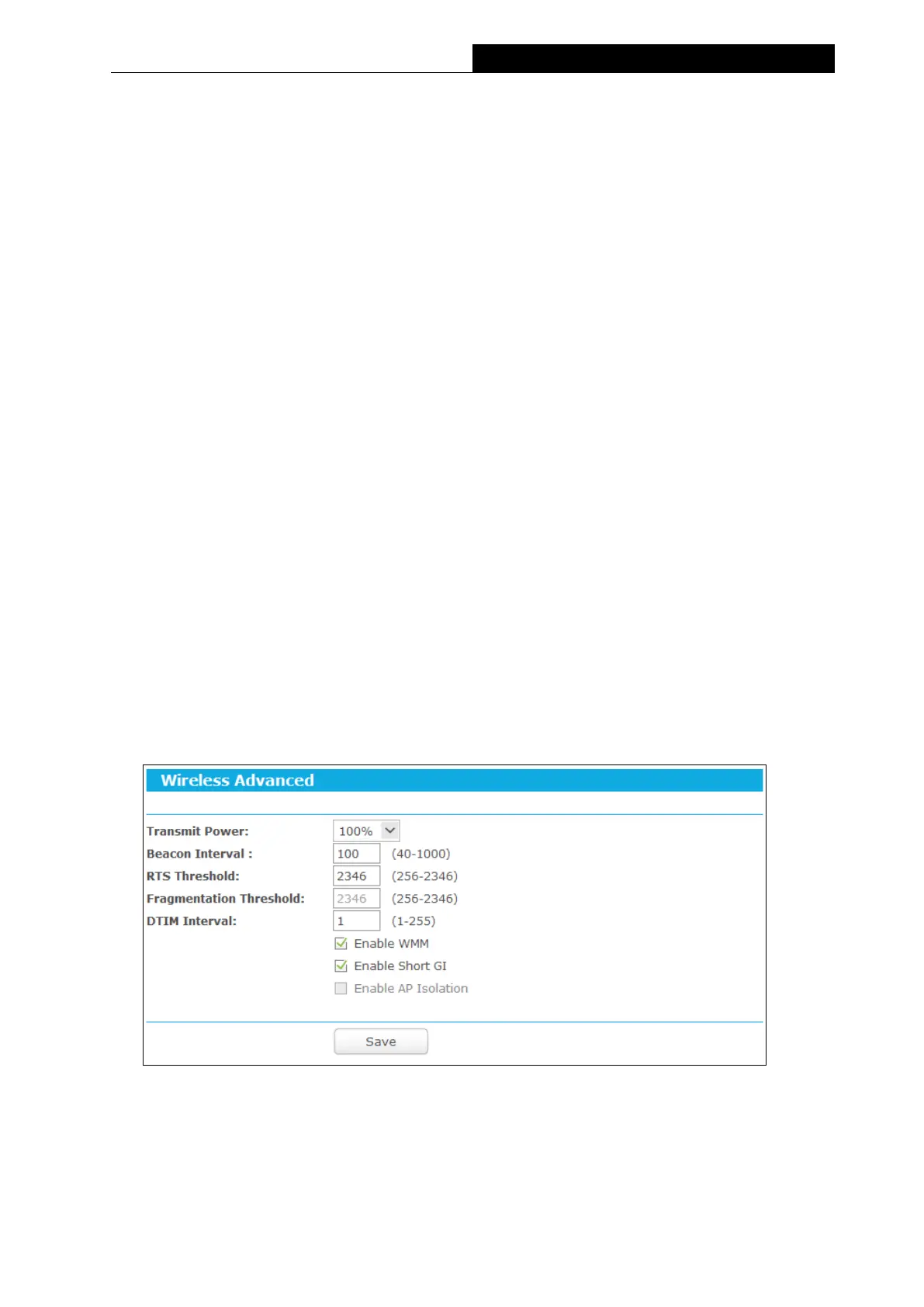 Go to “Setting→Wireless→Wireless Advanced”, and then you can configure the advanced