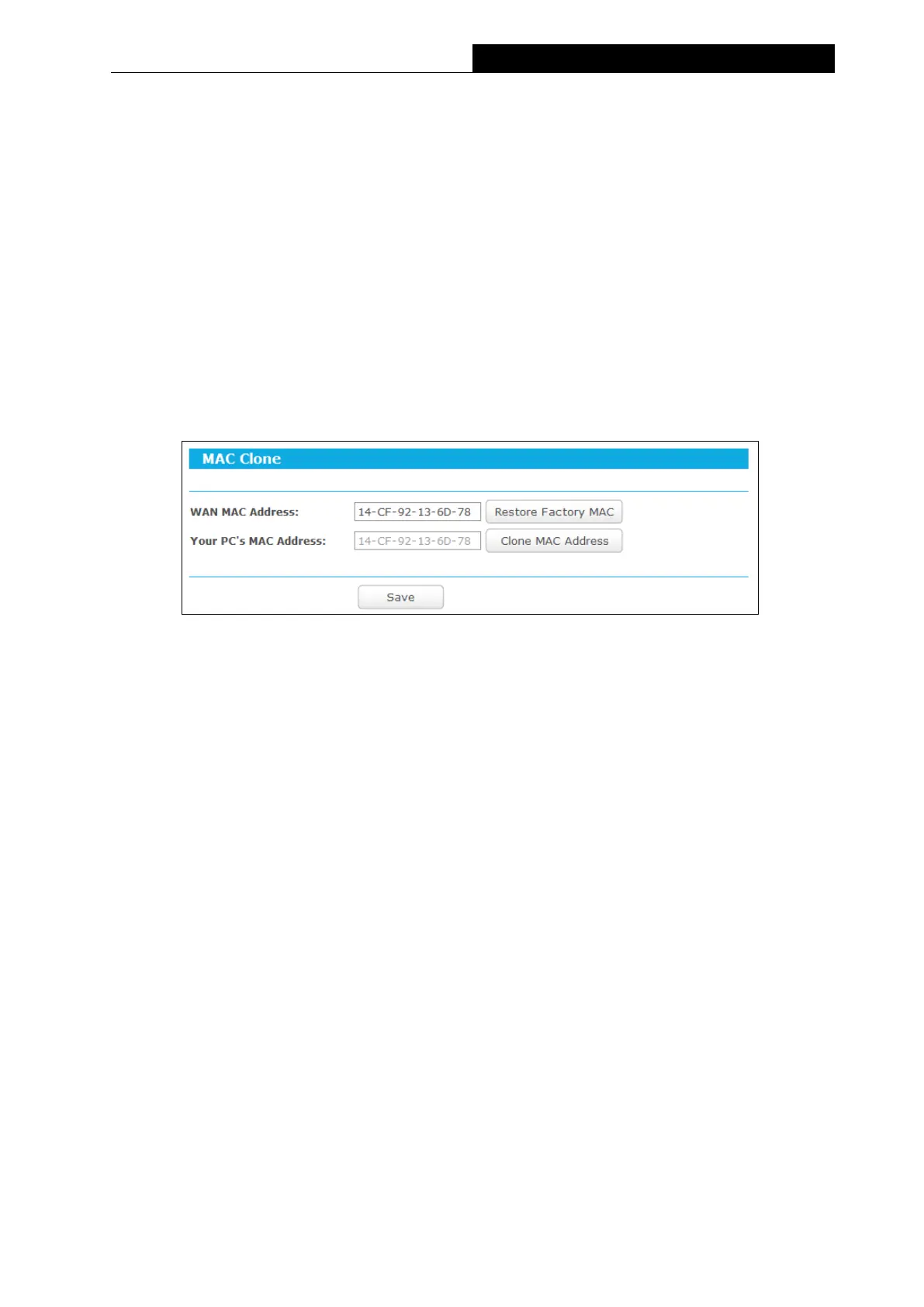 MAC Address" button and your PC’s MAC address will fill in the "WAN MAC Address"
