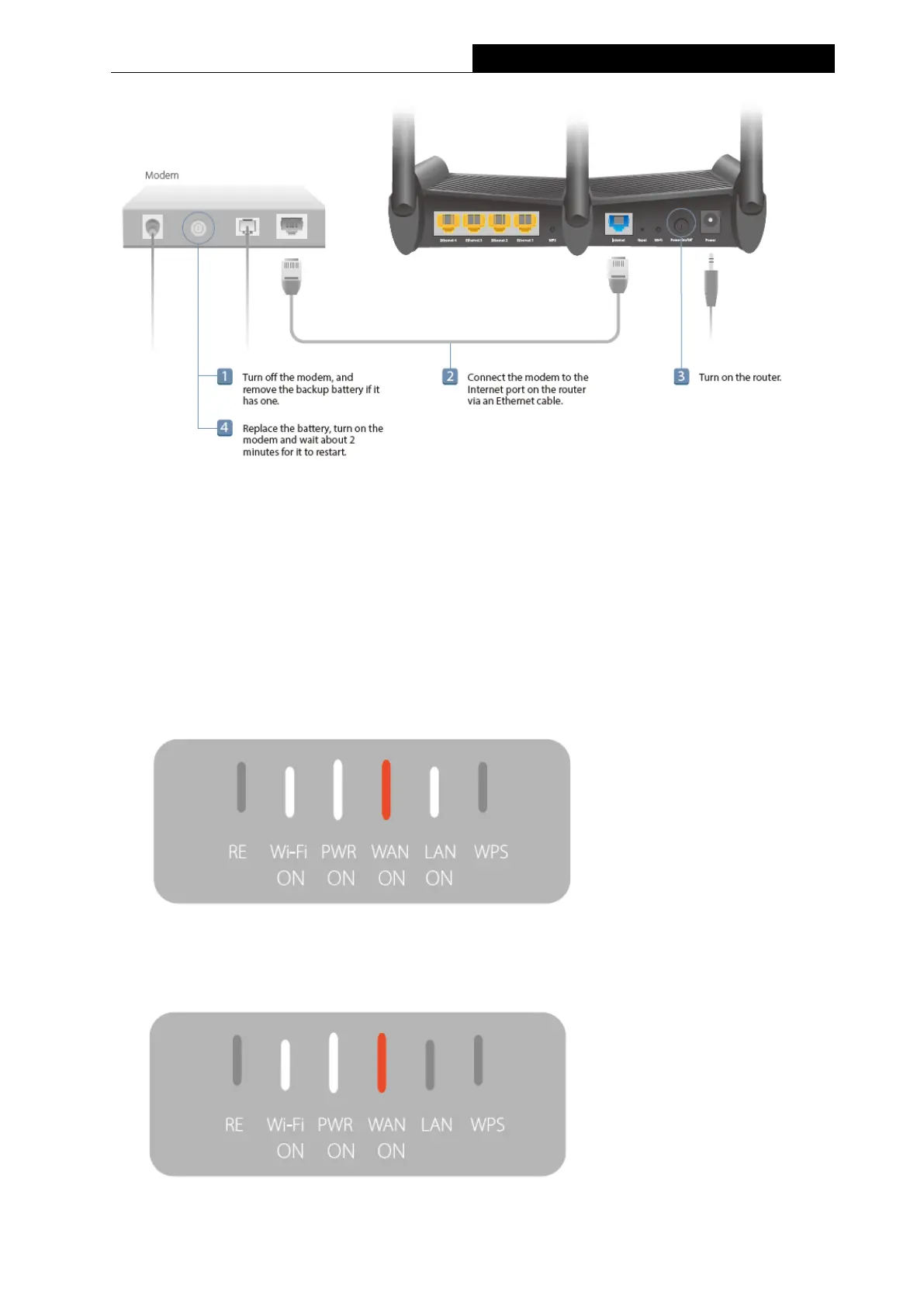 2. Connect the modem to the Internet port on the router via an Ethernet cable.