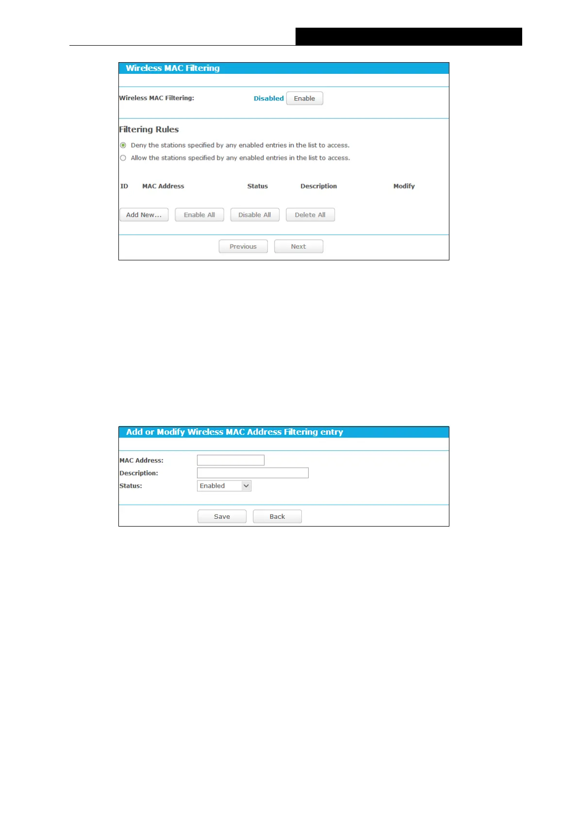 Modify Wireless MAC Address Filtering entry" page will appear.