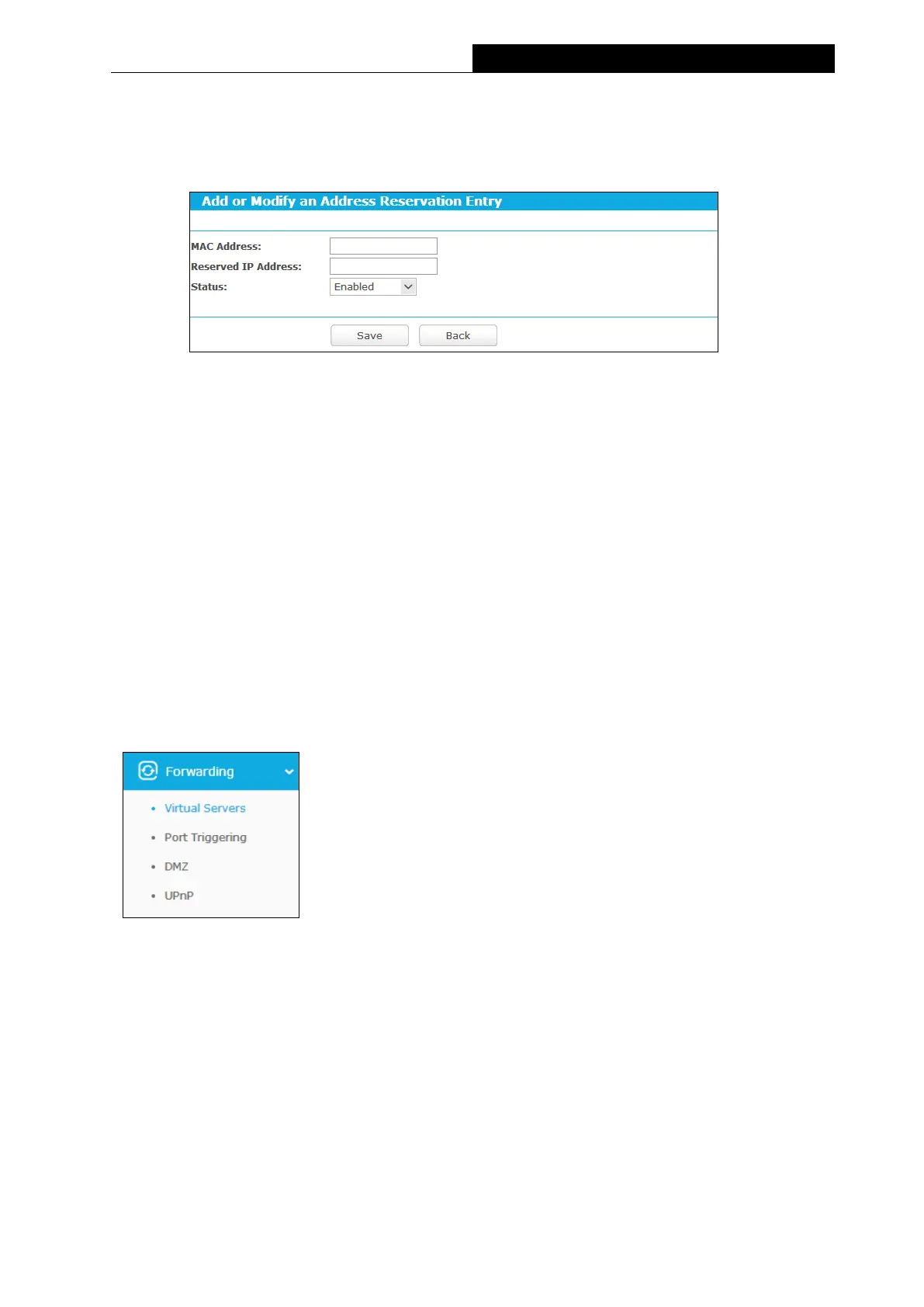 There are four submenus under the Forwarding menu: Virtual Servers, Port Triggering, DMZ