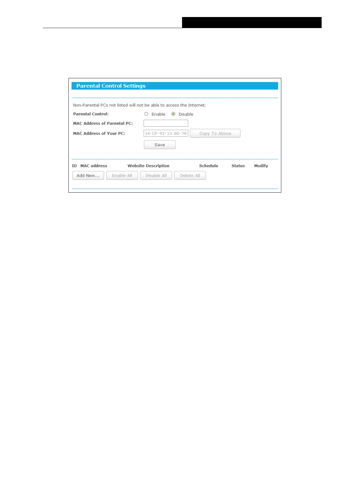 Copy To Above button to fill this address to the MAC Address of Parental PC field above.
