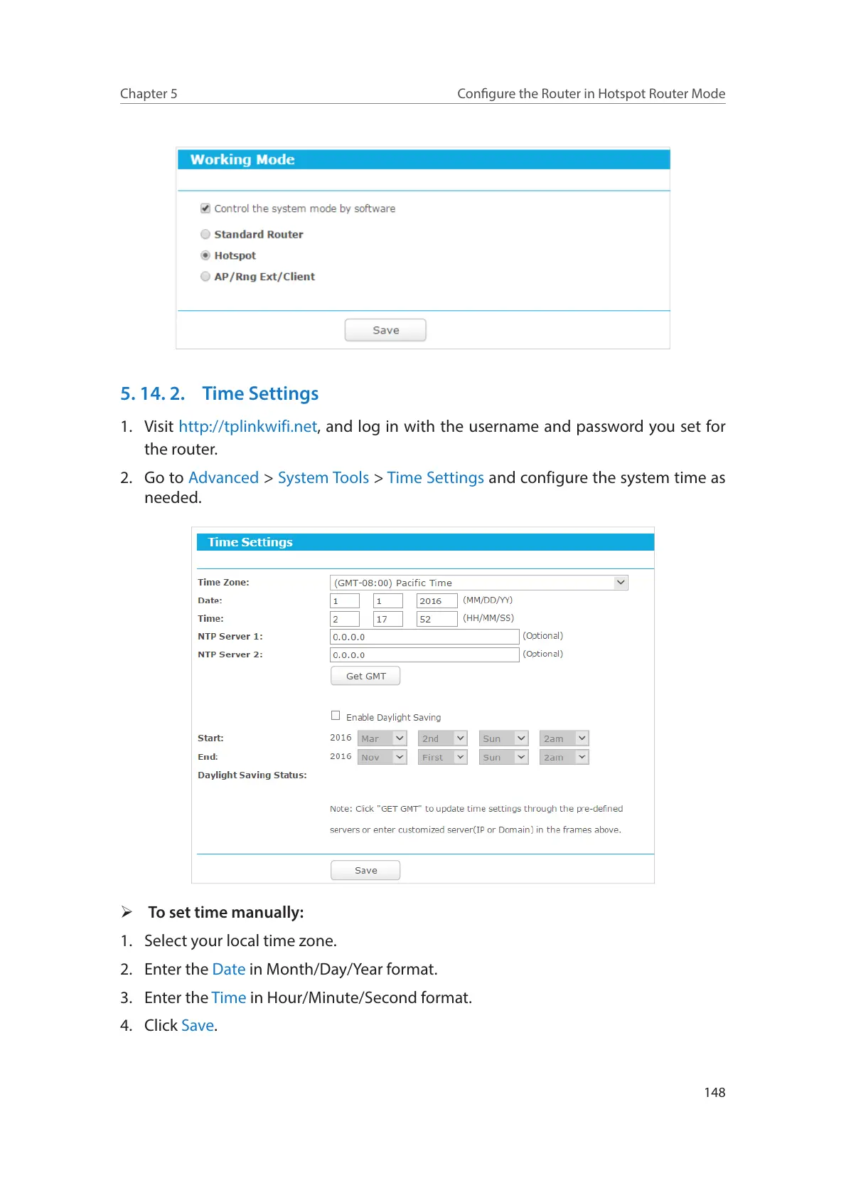 2. Go to Advanced > System Tools > Time Settings and configure the system time as